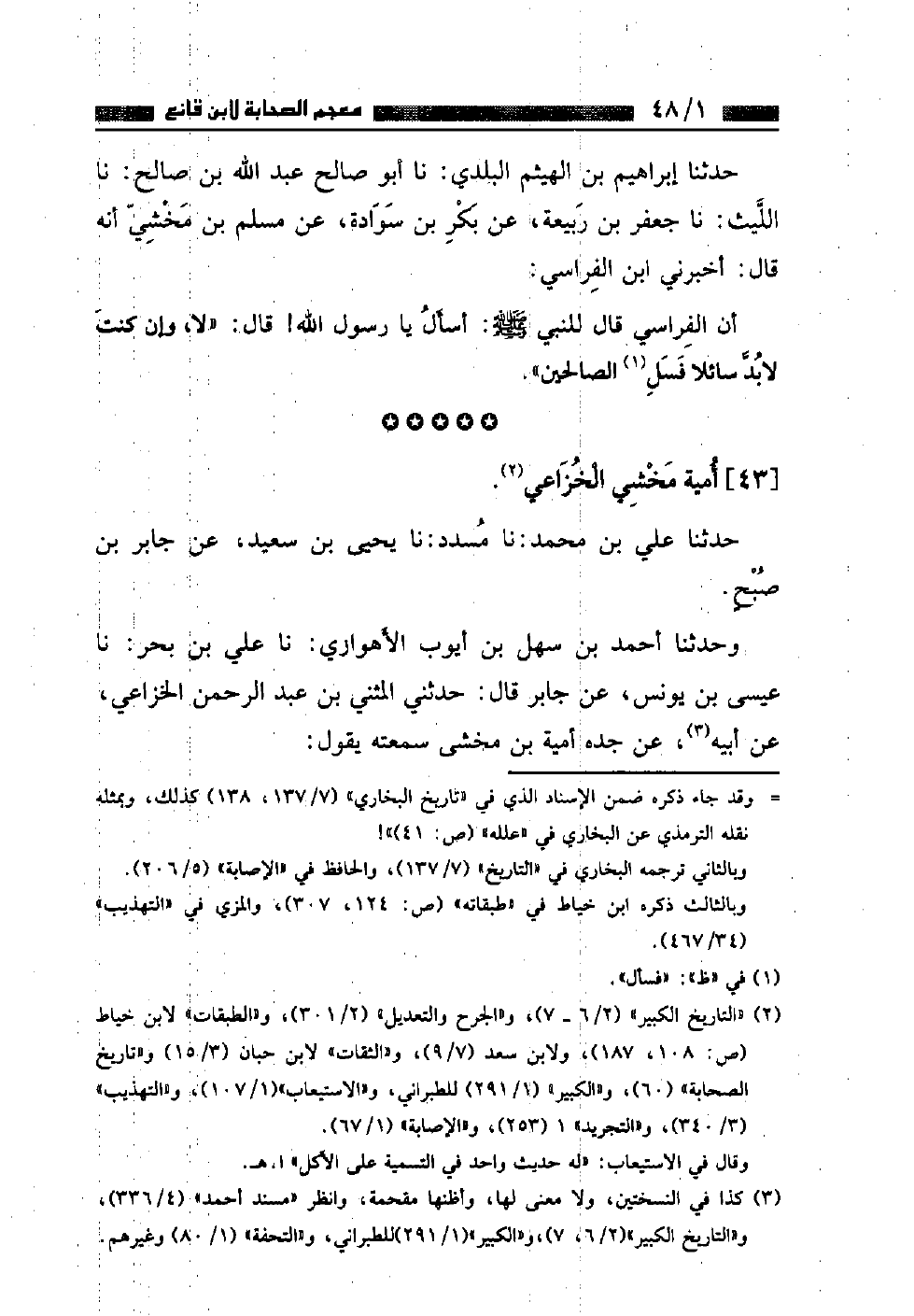 حَدَّثَنَا إِبْرَاهِيمُ بْنُ الْهَيْثَمِ الْبَلَدِيُّ، نا أَبُو صَالِحٍ عَبْدُ اللَّهِ بْنُ صَالِحٍ، نا اللَّيْثُ، نا جَعْفَرُ بْنُ رَبِيعَةَ، عَنْ بَكْرِ بْنِ سَوَادَةَ، عَنْ مُسْلِمِ بْنِ مَخْشِيٍّ، أَنَّهُ قَالَ: أَخْبَرَنِي ابْنُ الْفِرَاسِيِّ، أَنَّ الْفِرَاسِيَّ قَالَ لِلنَّبِيِّ صَلَّى اللهُ عَلَيْهِ وَسَلَّمَ: أَسْأَلُ يَا رَسُولَ اللَّهِ؟ قَالَ: «لَا وَإِنْ كُنْتَ لَا بُدَّ سَائِلًا فَسَلِ الصَّالِحِينَ»