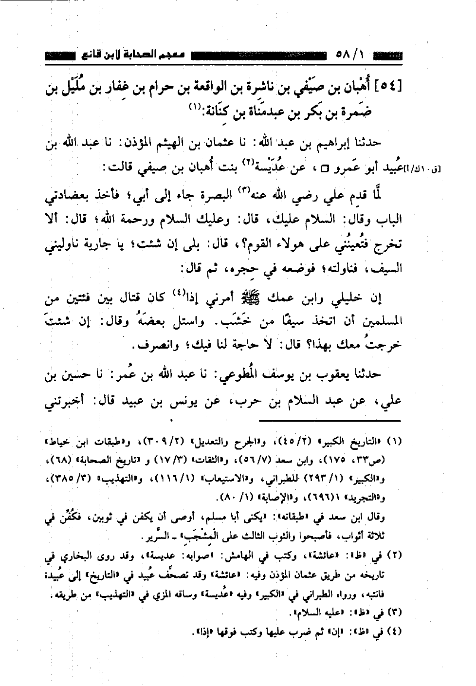 حَدَّثَنَا إِبْرَاهِيمُ بْنُ عَبْدِ اللَّهِ، نا عُثْمَانُ بْنُ الْهَيْثَمِ الْمُؤَذِّنُ، نا عَبْدُ اللَّهِ بْنُ عُبَيْدٍ أَبُو عَمْرٍو، عَنْ عُدَيْسَةَ بِنْتِ أُهْبَانَ بْنِ صَيْفِيُّ قَالَتْ: لَمَّا قَدِمَ عَلِيُّ رَضِيَ اللَّهُ عَنْهُ الْبَصْرَةَ جَاءَ إِلَى أَبِي فَأَخَذَ بِعِضَادَتَيِ الْبَابِ وَقَالَ: السَّلَامُ عَلَيْكَ قَالَ: وَعَلَيْكَ السَّلَامُ وَرَحْمَةُ اللَّهِ قَالَ أَلَا تَخْرُجُ فَتُعِينَنِي عَلَى هَؤُلَاءِ الْقَوْمِ؟ قَالَ: بَلَى إِنْ شِئْتَ يَا جَارِيَةُ نَاوِلِينِي السَّيْفَ، فَنَاوَلْتُهُ فَوَضَعَهُ فِي حِجْرِهِ ثُمَّ قَالَ: إِنَّ خَلِيلِي وَابْنَ عَمِّكَ صَلَّى اللهُ عَلَيْهِ وَسَلَّمَ «أَمَرَنِي إِذَا كَانَ قِتَالٌ بَيْنَ فِئَتَيْنِ مِنَ الْمُسْلِمِينَ أَنْ أَتَّخِذَ سَيْفًا مِنْ خَشَبٍ وَأَسْتَلَّ بَعْضَهُ» وَقَالَ: إِنْ شِئْتَ خَرَجْتُ مَعَكَ بِهَذَا، قَالَ: لَا حَاجَةَ لَنَا فِيكَ وَانْصَرَفَ حَدَّثَنَا يَعْقُوبُ بْنُ يُوسُفَ الْمُطَّوِّعِيُّ، نا عَبْدُ اللَّهِ بْنُ عُمَرَ، نا حُسَيْنُ بْنُ عَلِيٍّ، عَنْ عَبْدِ السَّلَامِ بْنِ حَرْبٍ، عَنْ يُونُسَ بْنِ عُبَيْدٍ قَالَ أَخْبَرَتْنِي ⦗٥٩⦘ عُدَيْسَةُ بِنْتُ أُهْبَانَ قَالَتْ: جَاءَ عَلِيُّ رَضِيَ اللَّهُ عَنْهُ إِلَى أَبِي ثُمَّ ذَكَرَ نَحْوًا مِنْهُ