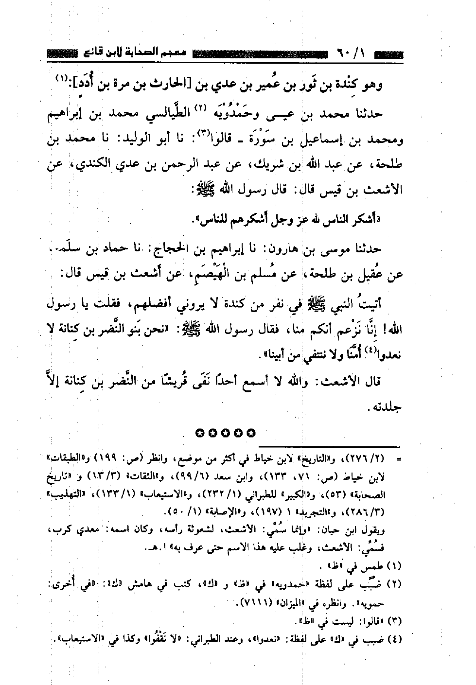حَدَّثَنَا مُحَمَّدُ بْنُ عِيسَى، وَحَمْدَوَيْهِ الطَّيَالِسِيُّ مُحَمَّدُ بْنُ إِبْرَاهِيمَ , وَمُحَمَّدُ بْنُ إِسْمَاعِيلَ بْنِ سُورَةَ قَالُوا: نا أَبُو الْوَلِيدِ، نا مُحَمَّدُ بْنُ طَلْحَةَ، عَنْ عَبْدِ اللَّهِ بْنِ شَرِيكٍ، عَنْ عَبْدِ الرَّحْمَنِ بْنِ عَدِيٍّ الْكِنْدِيُّ، عَنِ الْأَشْعَثِ بْنِ قَيْسٍ قَالَ: قَالَ رَسُولُ اللَّهِ صَلَّى اللهُ عَلَيْهِ وَسَلَّمَ: «أَشْكَرُ النَّاسِ لِلَّهِ عَزَّ وَجَلَّ أَشْكَرُهُمْ لِلنَّاسِ»