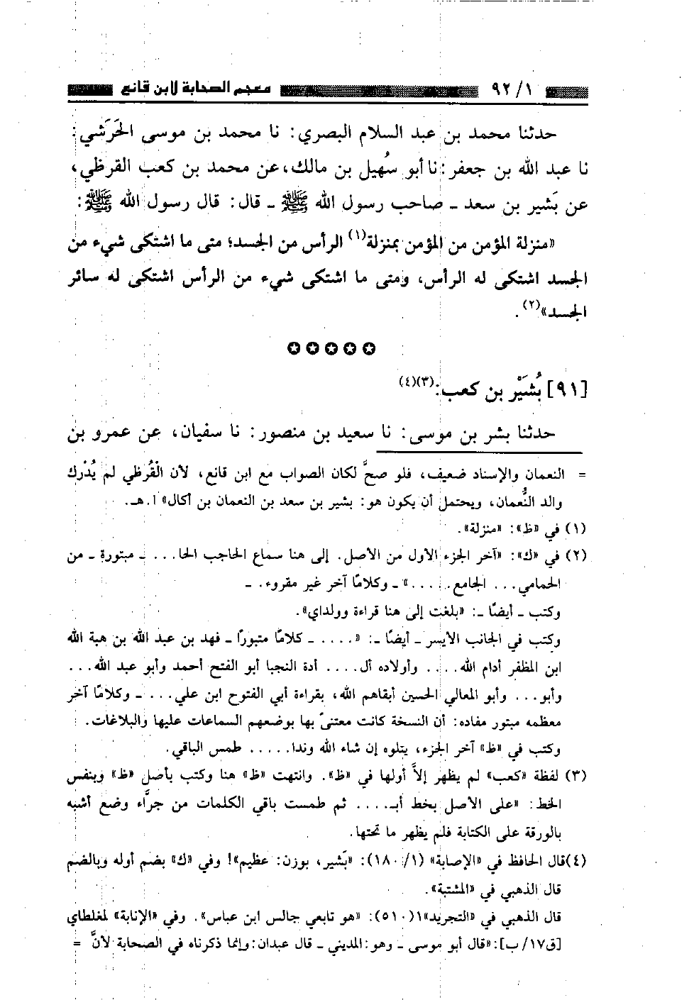 حَدَّثَنَا مُحَمَّدُ بْنُ عَبْدِ السَّلَامِ الْبَصْرِيُّ، نا مُحَمَّدُ بْنُ مُوسَى الْحَرَشِيُّ، نا عَبْدُ اللَّهِ بْنُ جَعْفَرٍ، نا أَبُو سُهَيْلِ بْنُ مَالِكٍ، عَنْ مُحَمَّدِ بْنِ كَعْبٍ الْقُرَظِيِّ، عَنْ بَشِيرِ بْنِ سَعْدٍ صَاحِبِ رَسُولِ اللَّهِ صَلَّى اللهُ عَلَيْهِ وَسَلَّمَ قَالَ: قَالَ رَسُولُ اللَّهِ صَلَّى اللهُ عَلَيْهِ وَسَلَّمَ: «مَنْزِلَةُ الْمُؤْمِنِ مِنَ الْمُؤْمِنِ بِمَنْزِلَةِ الرَّأْسِ مِنَ الْجَسَدِ مَتَى مَا اشْتَكَى شَيْءٌ مِنَ الْجَسَدِ اشْتَكَى لَهُ الرَّأْسُ وَمَتَى مَا اشْتَكَى شَيْءٌ مِنَ الرَّأْسِ اشْتَكَى لَهُ سَائِرُ الْجَسَدِ»