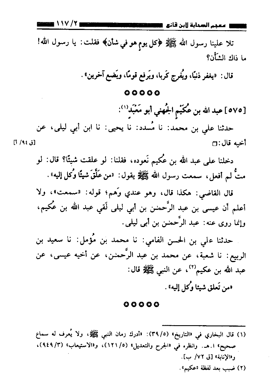 حَدَّثَنَا عَلِيُّ بْنُ مُحَمَّدٍ، نا مُسَدَّدٌ، نا يَحْيَى، نا ابْنُ أَبِي لَيْلَى، عَنْ أَخِيهِ قَالَ: دَخَلْنَا عَلَى عَبْدِ اللَّهِ بْنِ عُكَيْمٍ نَعُودُهُ , فَقُلْنَا: لَوْ عَلَّقْتَ شَيْئًا؟ قَالَ: لَوْ مِتُّ لَمْ أَفْعَلْ , سَمِعْتُ رَسُولَ اللَّهِ صَلَّى اللهُ عَلَيْهِ وَسَلَّمَ يَقُولُ: «مَنْ عَلَّقَ شَيْئًا وُكِلَ إِلَيْهِ» قَالَ الْقَاضِي: هَكَذَا قَالَ وَهُوَ عِنْدِي وَهْمٌ قَوْلُهُ: سَمِعْتُ , وَلَا أَعْلَمُ أَنَّ عِيسَى بْنَ عَبْدِ الرَّحْمَنِ بْنِ أَبِي لَيْلَى لَقِيَ عَبْدَ اللَّهِ بْنَ عُكَيْمٍ , وَإِنَّمَا رَوَى عَنْهُ عَبْدُ الرَّحْمَنِ بْنُ أَبَى لَيْلَى حَدَّثَنَا عَلِيُّ بْنُ الْحَسَنِ الْفَامِيُّ , نا مُحَمَّدُ بْنُ مُؤَمَّلٍ , نا سَعِيدُ بْنُ الرَّبِيعِ , نا شُعْبَةُ , عَنْ مُحَمَّدِ بْنِ عَبْدِ الرَّحْمَنِ , عَنْ أَخِيهِ عِيسَى عَنْ عَبْدِ اللَّهِ بْنِ عُكَيْمٍ عَنِ النَّبِيِّ صَلَّى اللهُ عَلَيْهِ وَسَلَّمَ قَالَ: «مَنْ تَعَلَّقَ شَيْئًا وُكِلَ إِلَيْهِ»