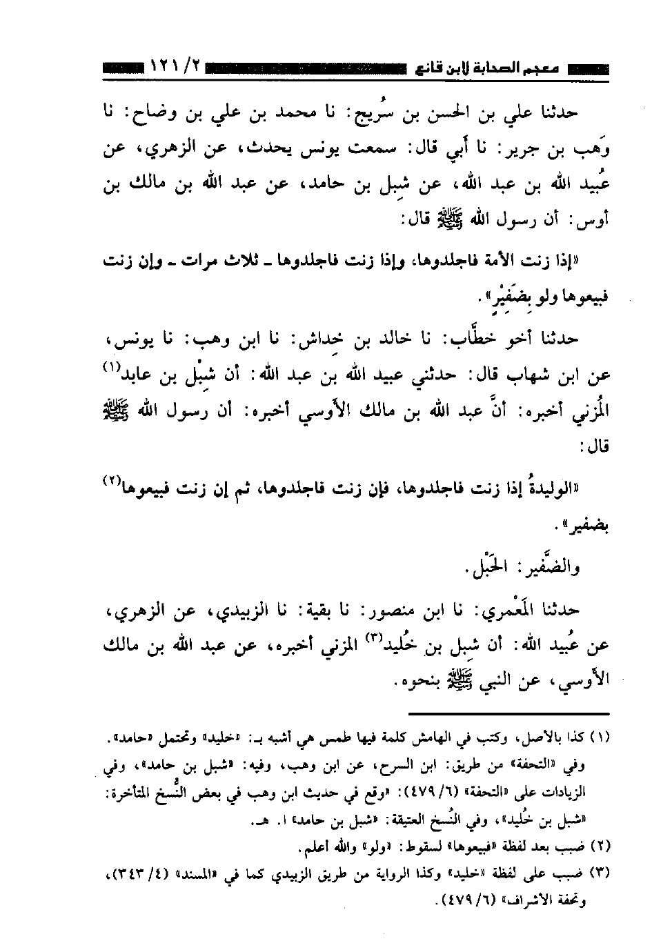 حَدَّثَنَا أَخُو خَطَّابٍ , نا خَالِدُ بْنُ خِدَاشٍ، نا ابْنُ وَهْبٍ، نا يُونُسُ، عَنِ ابْنِ شِهَابٍ قَالَ: حَدَّثَنِي عُبَيْدُ اللَّهِ بْنُ عَبْدِ اللَّهِ، أَنَّ شِبْلَ بْنَ حَامِدٍ الْمُزَنِيَّ أَخْبَرَهُ , أَنَّ عَبْدَ اللَّهِ بْنَ مَالِكٍ الْأَوْسِيَّ أَخْبَرَهُ أَنَّ رَسُولَ اللَّهِ صَلَّى اللهُ عَلَيْهِ وَسَلَّمَ قَالَ: «الْوَلِيدَةُ إِذَا زَنَتْ فَاجْلِدُوهَا , فَإِنْ زَنَتْ فَاجْلِدُوهَا , ثُمَّ إِنْ زَنَتْ فَبِيعُوهَا بِضَفِيرٍ» وَالضَّفِيرُ: الْحَبْلُ حَدَّثَنَا الْمَعْمَرِيُّ، نا ابْنُ مَنْصُورٍ، نا بَقِيَّةُ، نا الزُّبَيْدِيُّ، عَنِ الزُّهْرِيِّ، عَنْ عُبَيْدِ اللَّهِ، أَنَّ شِبْلَ بْنَ خُلَيْدٍ الْمُزَنِيَّ أَخْبَرَهُ , عَنْ عَبْدِ اللَّهِ بْنِ مَالِكٍ الْأَوْسِيِّ عَنِ النَّبِيِّ صَلَّى اللهُ عَلَيْهِ وَسَلَّمَ بِنَحْوِهِ