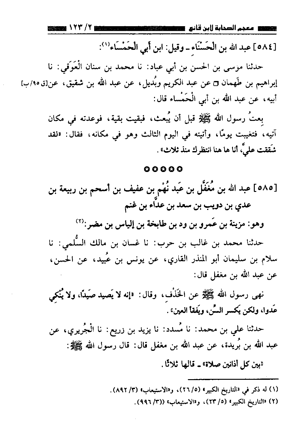 ٥٨٥ - عَبْدُ اللَّهِ بْنُ مُغَفَّلِ بْنِ عَبْدِ نُهْمِ بْنِ عَفِيفِ بْنِ أَسْحَمَ بْنِ رَبِيعَةَ بْنِ عَدِيِّ بْنِ ذُؤَيْبِ بْنِ سَعْدِ بْنِ عَدَّاءِ بْنِ غَنْمٍ , وَهُوَ مُزَيْنَةُ بْنُ عَمْرِو بْنِ وَدِّ بْنِ طَابِخَةَ بْنِ إِلْيَاسِ بْنِ مُضَرَ