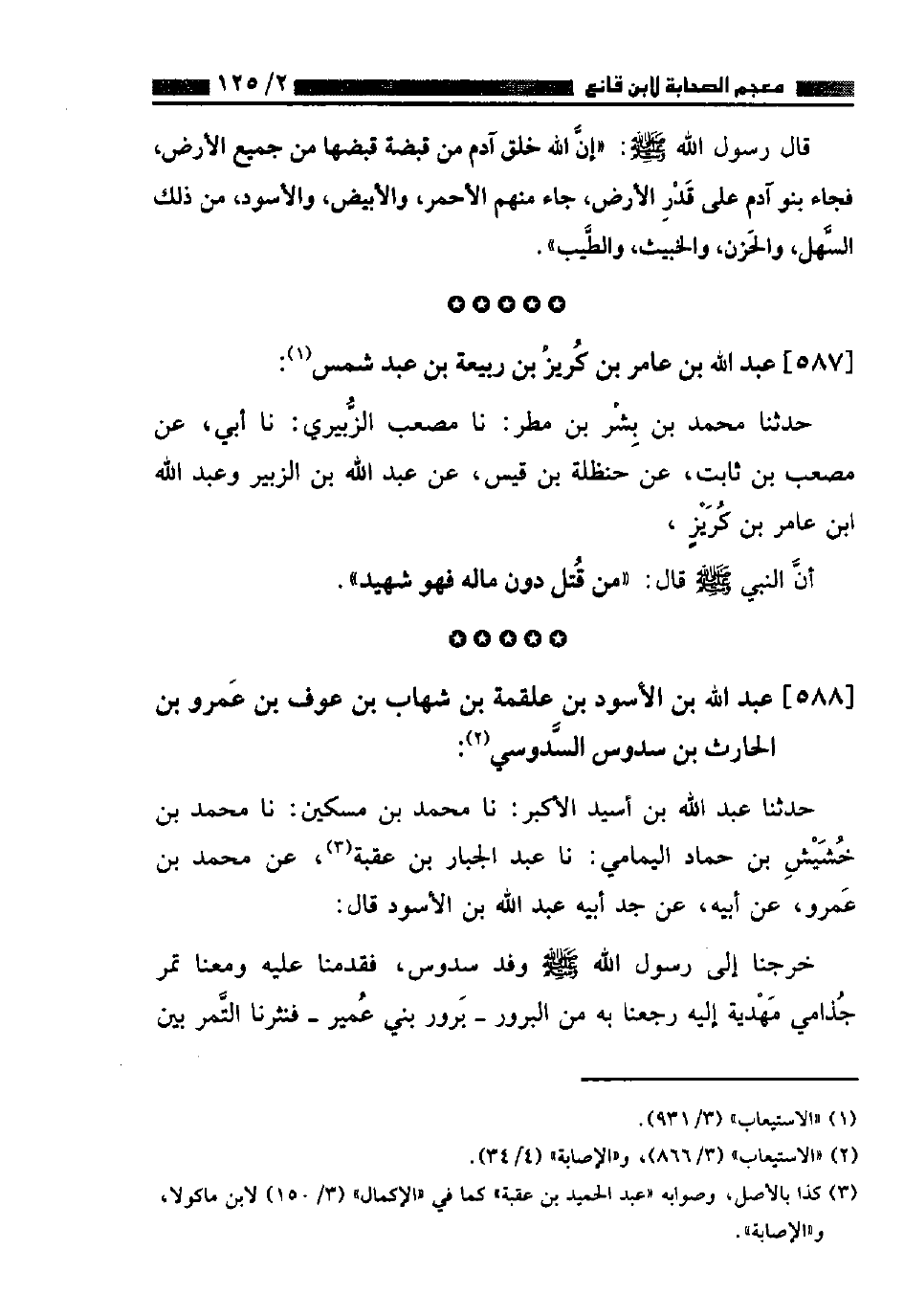 حَدَّثَنَا مُحَمَّدُ بْنُ بِشْرِ بْنِ مَطَرٍ، نا مُصْعَبٌ الزُّبَيْرِيُّ، نا أَبِي، عَنْ مُصْعَبِ بْنِ ثَابِتٍ، عَنْ حَنْظَلَةَ بْنِ قَيْسٍ، عَنْ عَبْدِ اللَّهِ بْنِ الزُّبَيْرِ، وَعَبْدِ اللَّهِ بْنِ عَامِرِ بْنِ كَرِيزٍ أَنَّ النَّبِيَّ صَلَّى اللهُ عَلَيْهِ وَسَلَّمَ قَالَ: «مَنْ قُتِلَ دُونَ مَالِهِ فَهُوَ شَهِيدٌ»