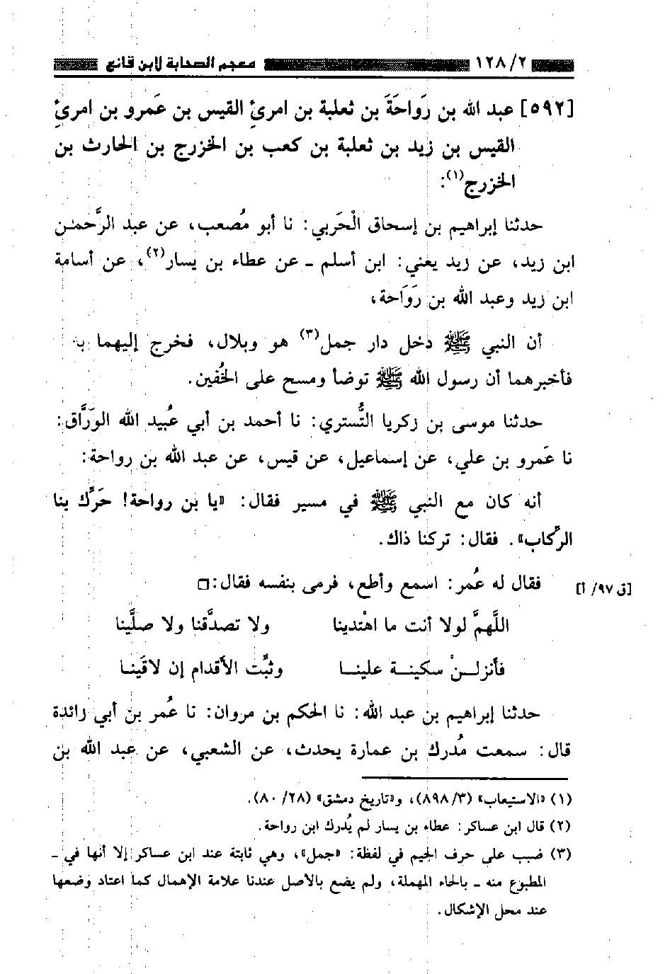 ٥٩٢ - عَبْدُ اللَّهِ بْنُ رَوَاحَةَ بْنِ ثَعْلَبَةَ بْنِ امْرِئِ الْقَيْسِ بْنِ عَمْرِو بْنِ امْرِئِ الْقَيْسِ بْنِ زَيْدِ بْنِ ثَعْلَبَةَ بْنِ كَعْبِ بْنِ الْخَزْرَجِ بْنِ الْحَارِثِ بْنِ الْخَزْرَجِ