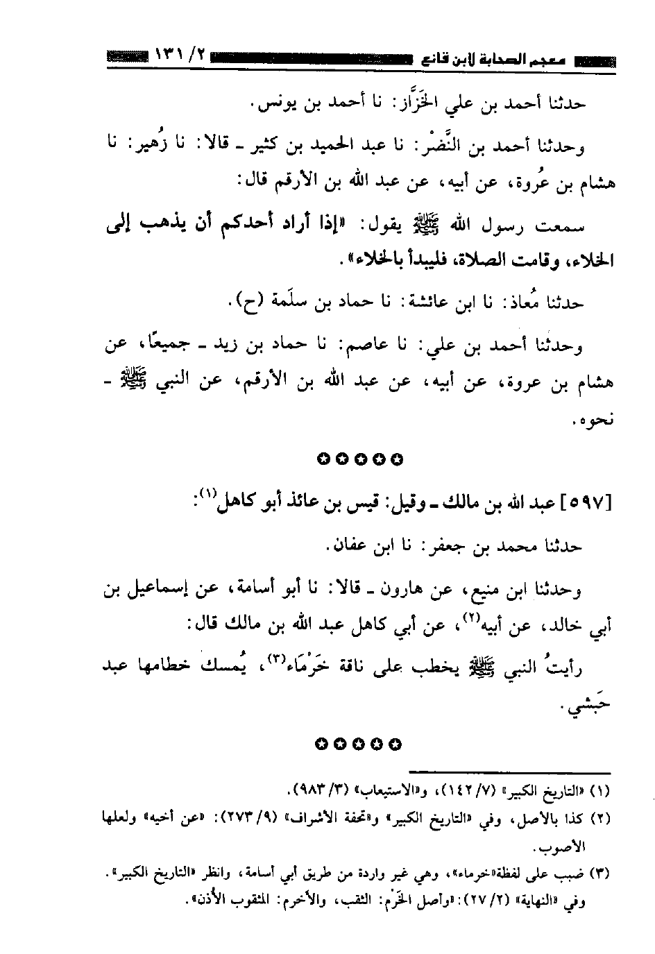 حَدَّثَنَا مُحَمَّدُ بْنُ جَعْفَرٍ، نا ابْنُ عَفَّانَ، وَحَدَّثَنَا ابْنُ مَنِيعٍ، عَنْ هَارُونَ قَالَا: نا أَبُو أُسَامَةَ، عَنْ إِسْمَاعِيلَ بْنِ أَبِي خَالِدٍ، عَنْ أَبِيهِ، عَنْ أَبِي كَاهِلٍ عَبْدِ اللَّهِ بْنِ مَالِكٍ قَالَ: «رَأَيْتُ النَّبِيَّ صَلَّى اللهُ عَلَيْهِ وَسَلَّمَ يَخْطُبُ عَلَى نَاقَةٍ خَرْمَاءَ يُمْسِكُ خِطَامَهَا عَبْدٌ حَبَشِيُّ»