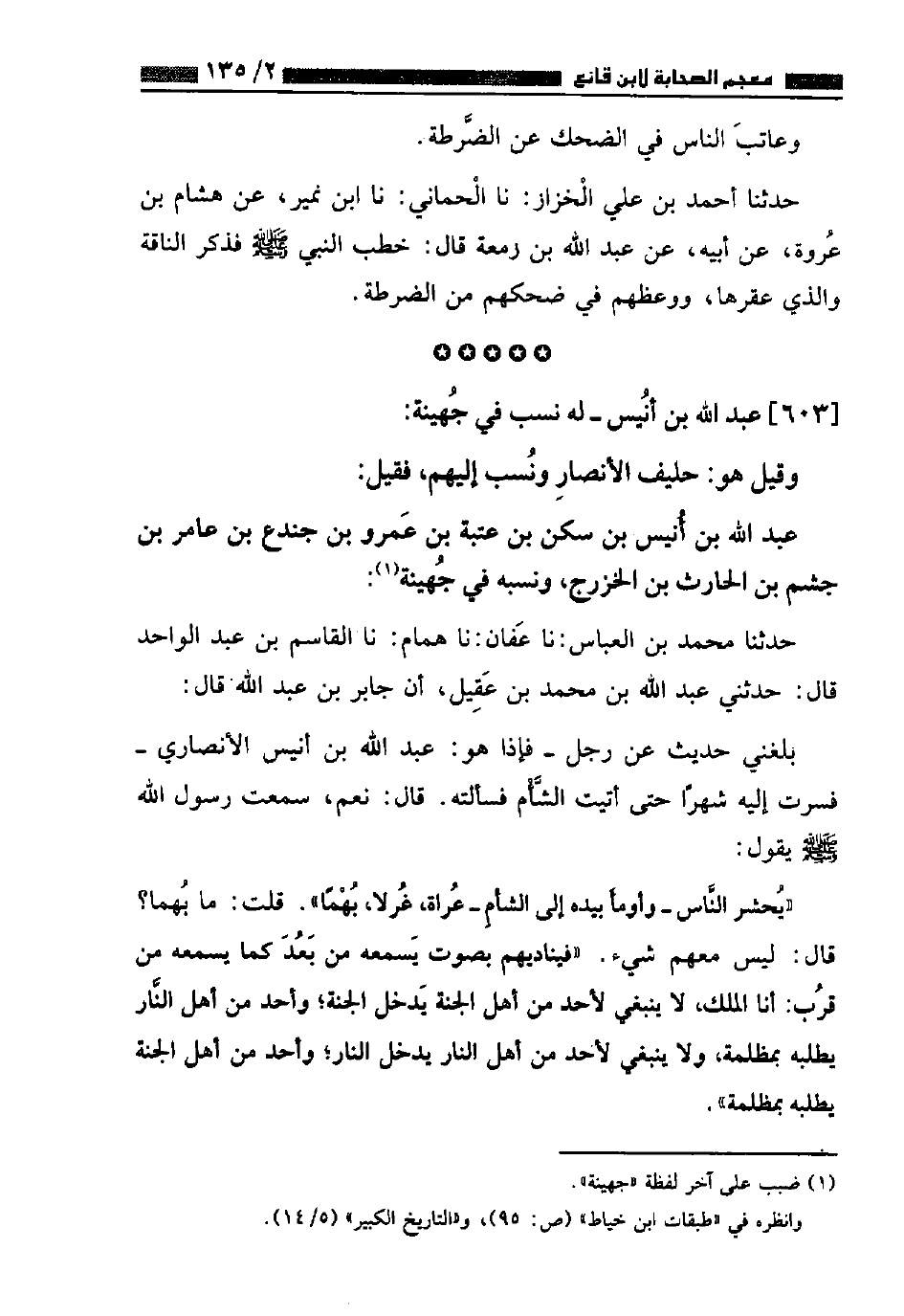 ٦٠٣ - عَبْدُ اللَّهِ بْنُ أُنَيْسٍ لَهُ نَسَبٌ فِي جُهَيْنَةَ , وَقِيلَ: هُوَ حَلِيفُ الْأَنْصَارِ , وَنُسِبَ إِلَيْهِمْ , فَقِيلَ: عَبْدُ اللَّهِ بْنُ أُنَيْسِ بْنِ سَكَنِ بْنِ عُتْبَةَ بْنِ عَمْرِو بْنِ جُنْدَعِ بْنِ عَامِرِ بْنِ جُشَمِ بْنِ الْحَارِثِ بْنِ الْخَزْرَجِ , وَنَسَبَهُ فِي جُهَيْنَةَ