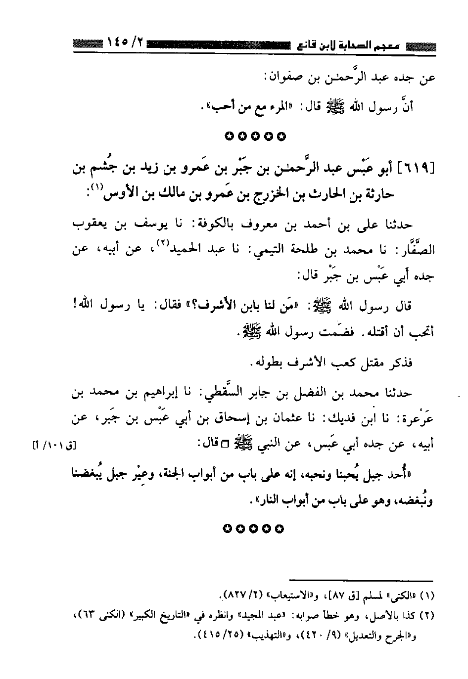 حَدَّثَنَا مُحَمَّدُ بْنُ الْفَضْلِ بْنِ جَابِرٍ السَّقَطِيُّ، نا إِبْرَاهِيمُ بْنُ مُحَمَّدِ بْنِ عَرْعَرَةَ، نا ابْنُ فُدَيْكٍ، نا عُثْمَانُ بْنُ إِسْحَاقَ بْنِ أَبِي عَبْسِ بْنِ جَبْرٍ، عَنْ أَبِيهِ، عَنْ جَدِّهِ أَبِي عَبْسٍ عَنِ النَّبِيِّ صَلَّى اللهُ عَلَيْهِ وَسَلَّمَ قَالَ: «أُحُدٌ جَبَلٌ يُحِبُّنَا وَنُحِبُّهُ , إِنَّهُ عَلَى بَابٍ مِنْ أَبْوَابِ الْجَنَّةِ , وَعِيرٌ جَبَلٌ يُبْغِضُنَا وَنُبْغِضُهُ , وَهُوَ عَلَى بَابٍ مِنْ أَبْوَابِ النَّارِ»