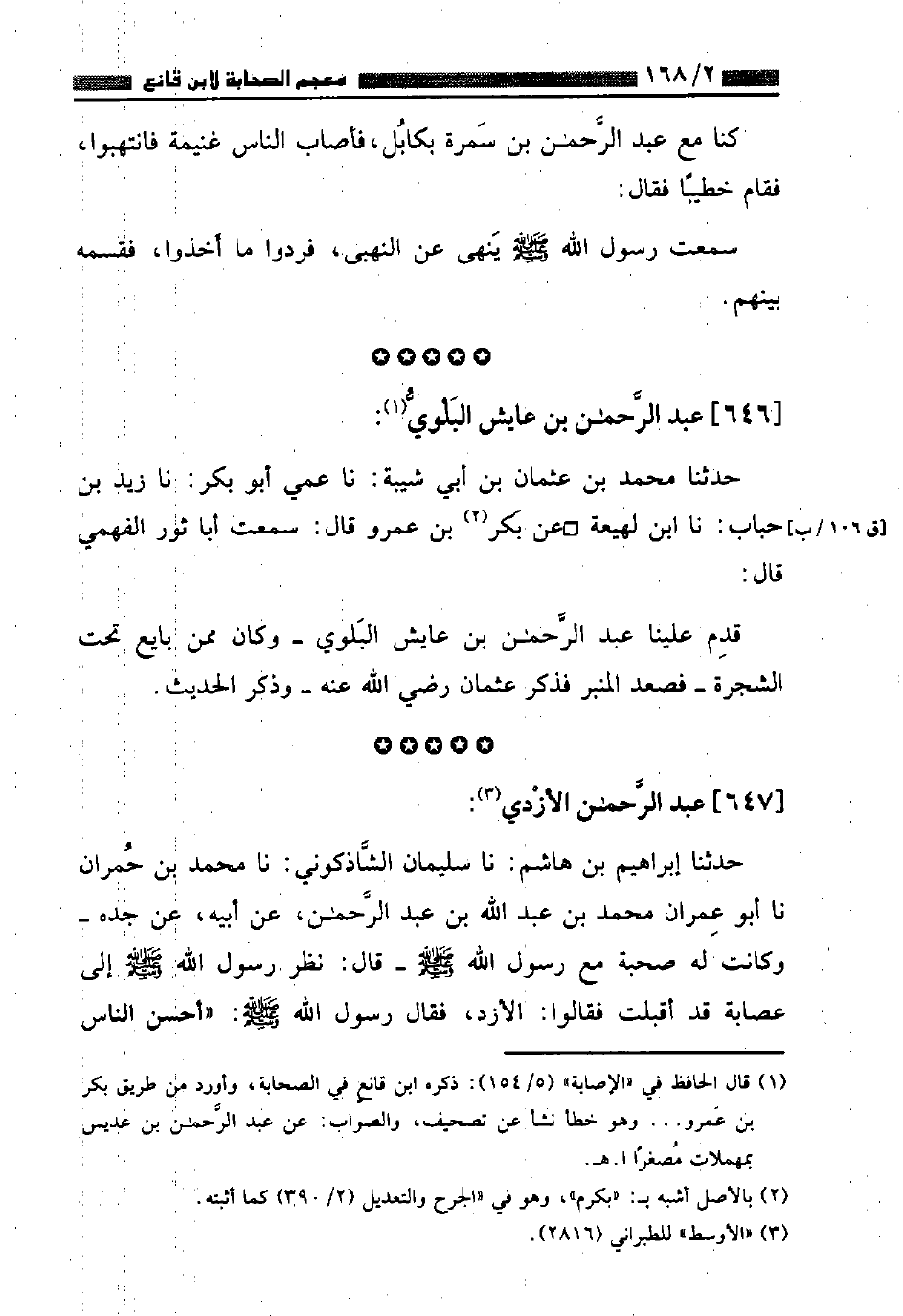 ٦٤٦ - عَبْدُ الرَّحْمَنِ بْنُ عَايِشٍ الْبَلَوِيُّ حَدَّثَنَا مُحَمَّدُ بْنُ عُثْمَانَ بْنِ أَبِي شَيْبَةَ، نا عَمِّي أَبُو بَكْرٍ، نا زَيْدُ بْنُ حُبَابٍ، نا ابْنُ لَهِيعَةَ، , عَنْ بَكْرِ بْنِ عَمْرٍو قَالَ: سَمِعْتُ أَبَا ثَوْرٍ الْفَهْمِيَّ قَالَ: قَدِمَ عَلَيْنَا عَبْدُ الرَّحْمَنِ بْنُ عَايِشٍ الْبَلَوِيُّ، وَكَانَ مِمَّنْ بَايَعَ تَحْتَ الشَّجَرَةِ , فَصَعِدَ الْمِنْبَرَ فَذَكَرَ عُثْمَانَ رَضِيَ اللَّهُ عَنْهُ , وَذَكَرَ الْحَدِيثَ