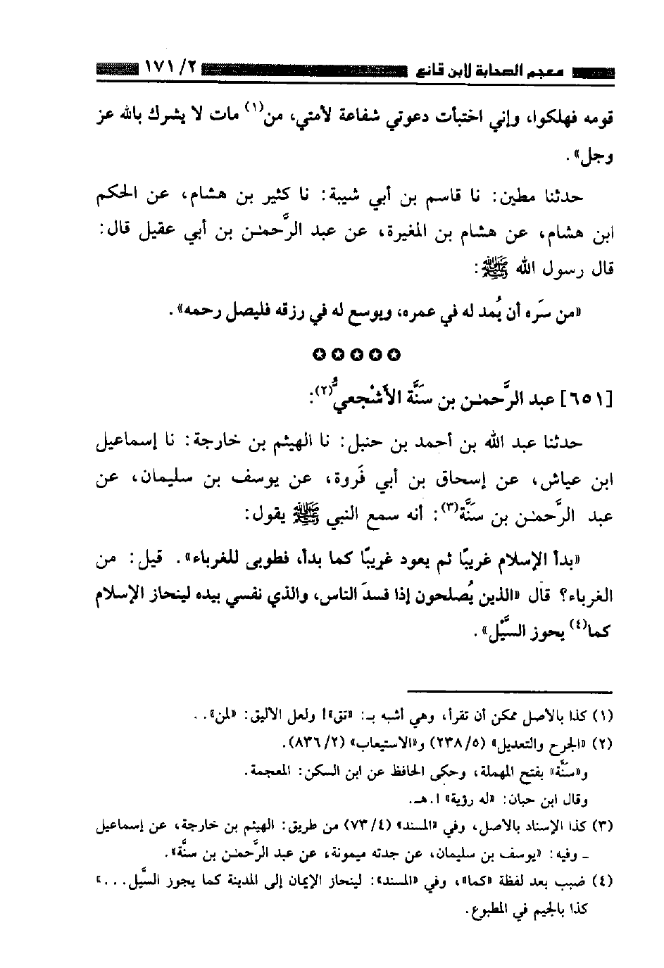 حَدَّثَنَا عَبْدُ اللَّهِ بْنُ أَحْمَدَ بْنِ حَنْبَلٍ، نا الْهَيْثَمُ بْنُ خَارِجَةَ، نا إِسْمَاعِيلُ بْنُ عَيَّاشٍ، عَنْ إِسْحَاقَ بْنِ أَبِي فَرْوَةَ، عَنْ يُوسُفَ بْنِ سُلَيْمَانَ، عَنْ عَبْدِ الرَّحْمَنِ بْنِ سَنَّةَ أَنَّهُ سَمِعَ النَّبِيَّ صَلَّى اللهُ عَلَيْهِ وَسَلَّمَ يَقُولُ: «بَدَأَ الْإِسْلَامُ غَرِيبًا , ثُمَّ يَعُودُ غَرِيبًا كَمَا بَدَأَ , فَطُوبَى لِلْغُرَبَاءِ» , قِيلَ: مَنِ الْغُرَبَاءُ؟ قَالَ: «الَّذِينَ يُصْلِحُونَ إِذَا فَسَدَ النَّاسُ , وَالَّذِي نَفْسِي بِيَدِهِ لَيَنْحَازُ الْإِسْلَامُ كَمَا يَحُوزُ السَّيْلُ» ⦗١٧٢⦘ قَالَ الْقَاضِي فِي كِتَابِي بِخَطِّي: عَنْ مُحَمَّدِ بْنِ يَحْيَى بْنِ الْمُنْذِرِ , عَنْ مُوسَى بْنِ إِسْمَاعِيلَ , عَنْ أَبَانَ , عَنْ يَحْيَى بْنِ أَبِي كَثِيرٍ , عَنْ أَبِي قِلَابَةَ , عَنْ عَبْدِ الرَّحْمَنِ بْنِ سَنَّةَ , أَنَّ رَسُولَ اللَّهِ صَلَّى اللهُ عَلَيْهِ وَسَلَّمَ طَرَقَهُ وَجَعٌ , فَجَعَلَ يَتَقَلَّبُ عَلَى فِرَاشٍ وَذَكَرَ الْحَدِيثَ