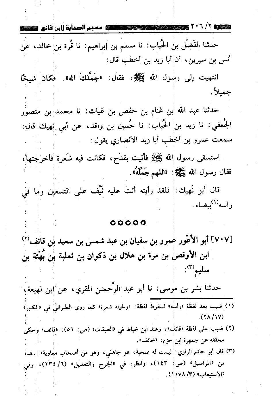 حَدَّثَنَا الْفَضْلُ بْنُ الْحُبَابِ، نا مُسْلِمُ بْنُ إِبْرَاهِيمَ، نا قُرَّةُ بْنُ خَالِدٍ، عَنْ أَنَسِ بْنِ سِيرِينَ، أَنَّ أَبَا زَيْدِ بْنَ أَخْطَبَ قَالَ: انْتَهَيْتُ إِلَى رَسُولِ اللَّهِ صَلَّى اللهُ عَلَيْهِ وَسَلَّمَ فَقَالَ: «جَمَّلَكَ اللَّهُ» , فَكَانَ شَيْخًا جَمِيلًا