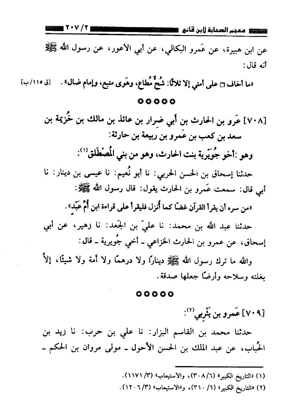 ٧٠٨ - عَمْرُو بْنُ الْحَارِثِ بْنِ أَبِي ضِرَارِ بْنِ عَائِذِ بْنِ مَالِكِ بْنِ خُزَيْمَةَ بْنِ سَعْدِ بْنِ كَعْبِ بْنِ عَمْرِو بْنِ رَبِيعَةَ بْنِ حَارِثَةَ وَهُوَ أَخُو جُوَيْرِيَةَ بِنْتُ الْحَارِثِ وَهُوَ مِنْ بَنِي الْمُصْطَلِقِ