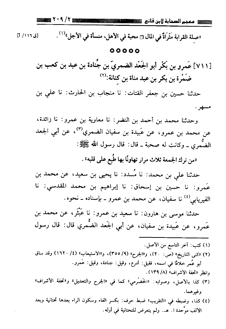 حَدَّثَنَا حُسَيْنُ بْنُ جَعْفَرٍ الْقَتَّاتُ، نا مِنْجَابُ بْنُ الْحَارِثِ، نا عَلِيُّ بْنُ مُسْهِرٍ، وَحَدَّثَنَا مُحَمَّدُ بْنُ أَحْمَدَ بْنِ النَّضْرِ، نا مُعَاوِيَةُ بْنُ عَمْرٍو، نا زَائِدَةُ، عَنْ مُحَمَّدِ بْنِ عَمْرٍو، عَنْ عُبَيْدَةَ بْنِ سُفْيَانَ الضَّمْرِيِّ، عَنْ أَبِي الْجَعْدِ الضَّمْرِيِّ، وَكَانَتْ لَهُ صُحْبَةٌ قَالَ: قَالَ رَسُولُ اللَّهِ صَلَّى اللهُ عَلَيْهِ وَسَلَّمَ: «مَنْ تَرَكَ الْجُمُعَةَ ثَلَاثَ مِرَارٍ تَهَاوُنًا بِهَا , طُبِعَ عَلَى قَلْبِهِ» حَدَّثَنَا عَلِيُّ بْنُ مُحَمَّدٍ، نا مُسَدَّدٌ، نا يَحْيَى بْنُ سَعِيدٍ , عَنْ مُحَمَّدِ بْنِ عَمْرٍو، نا حُسَيْنُ بْنُ إِسْحَاقَ، نا إِبْرَاهِيمُ بْنُ مُحَمَّدٍ الْمَقْدِسِيُّ، نا الْفِرْيَابِيُّ , نا سُفْيَانُ، عَنْ مُحَمَّدِ بْنِ عَمْرٍو بِإِسْنَادِهِ نَحْوَهُ
