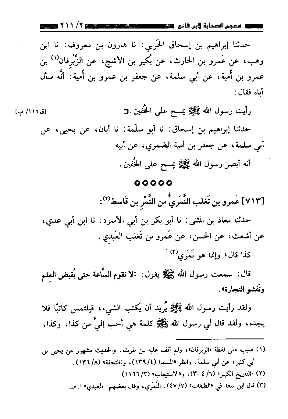 حَدَّثَنَا مُعَاذُ بْنُ الْمُثَنَّى، نا أَبُو بَكْرِ بْنُ أَبِي الْأَسْوَدِ، نا ابْنُ أَبِي عَدِيٍّ، عَنْ أَشْعَثَ، عَنِ الْحَسَنِ، عَنْ عَمْرِو بْنِ تَغْلِبَ الْعَبْدِيِّ - كَذَا قَالَ وَإِنَّمَا هُوَ نَمَرِيُّ - قَالَ: سَمِعْتُ رَسُولَ اللَّهِ صَلَّى اللهُ عَلَيْهِ وَسَلَّمَ يَقُولُ: «لَا تَقُومُ السَّاعَةُ حَتَّى يُقْبَضَ الْعِلْمُ , وَتَفْشُوَ التِّجَارَةُ» , وَلَقَدْ رَأَيْتُ رَسُولَ اللَّهِ صَلَّى اللهُ عَلَيْهِ وَسَلَّمَ يُرِيدُ أَنْ يَكْتُبَ الشَّيْءَ فَيَلْتَمِسَ كَاتِبًا فَلَا يَجِدُهُ , وَلَقَدْ قَالَ لِي رَسُولُ اللَّهِ صَلَّى اللهُ عَلَيْهِ وَسَلَّمَ كَلِمَةً , هِيَ أَحَبُّ إِلَيَّ مِنْ كَذَا وَكَذَا , ⦗٢١٢⦘ خَرَجَ عَلَى أَهْلِ الصُّفَّةِ فَقَالَ: «إِنِّي أُعْطِي قَوْمًا مَخَافَةَ هَلَعِهِمْ وَجَزَعِهِمْ , وَأَدَعُ آخَرِينَ , أَكِلُهُمْ إِلَى مَا جَعَلَ اللَّهُ فِي قُلُوبِهِمْ , مِنْهُمْ عَمْرُو بْنُ تَغْلِبَ»