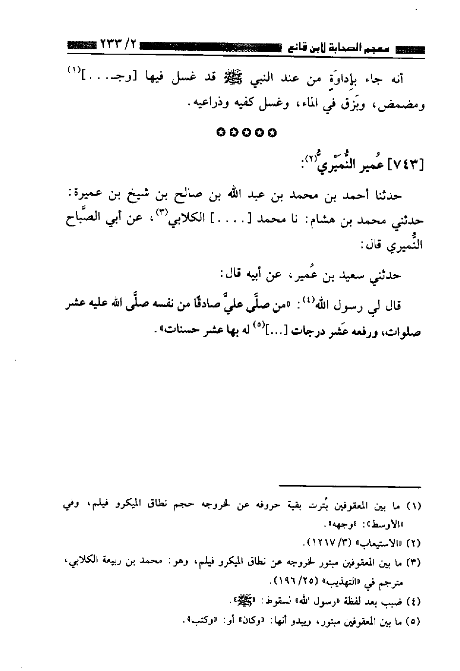 حَدَّثَنَا أَحْمَدُ بْنُ مُحَمَّدِ بْنِ عَبْدِ اللَّهِ بْنِ صَالِحِ بْنِ شَيْخِ بْنِ عَمِيرَةَ، حَدَّثَنِي مُحَمَّدُ بْنُ هِشَامٍ، نا مُحَمَّدٌ الْكِلَابِيُّ، عَنْ أَبِي الصَّبَّاحِ النُّمَيْرِيِّ قَالَ: حَدَّثَنِي سَعِيدُ بْنُ عُمَيْرٍ، عَنْ أَبِيهِ قَالَ: قَالَ لِي رَسُولُ اللَّهِ صَلَّى اللهُ عَلَيْهِ وَسَلَّمَ: «مَنْ صَلَّى عَلَيَّ صَادِقًا مِنْ نَفْسِهِ , صَلَّى اللَّهُ عَلَيْهِ عَشْرَ صَلَوَاتٍ , وَرَفَعَهُ عَشْرَ دَرَجَاتٍ , لَهُ بِهَا عَشْرُ حَسَنَاتٍ»