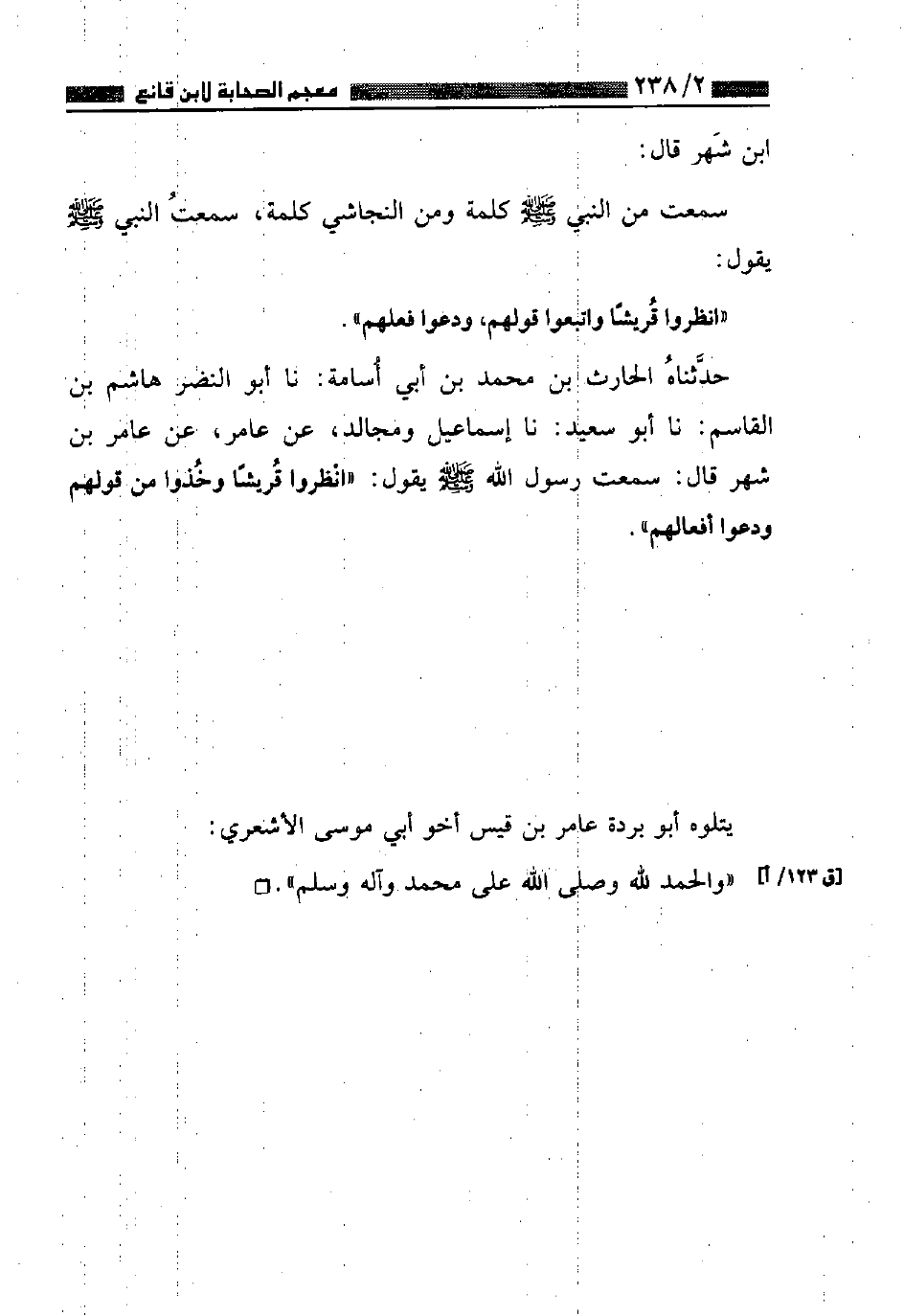 حَدَّثَنَاهُ الْحَارِثُ بْنُ مُحَمَّدِ بْنِ أَبِي أُسَامَةَ، نا أَبُو النَّضْرِ هَاشِمُ بْنُ الْقَاسِمِ , نا أَبُو سَعِيدٍ، نا إِسْمَاعِيلُ، وَمُجَالِدٌ، عَنْ عَامِرٍ، عَنْ عَامِرِ بْنِ شَهْرٍ قَالَ: سَمِعْتُ رَسُولَ اللَّهِ صَلَّى اللهُ عَلَيْهِ وَسَلَّمَ يَقُولُ: «انْظُرُوا قُرَيْشًا , وَخُذُوا مِنْ قَوْلِهِمْ , وَدَعُوا أَفْعَالَهُمْ»