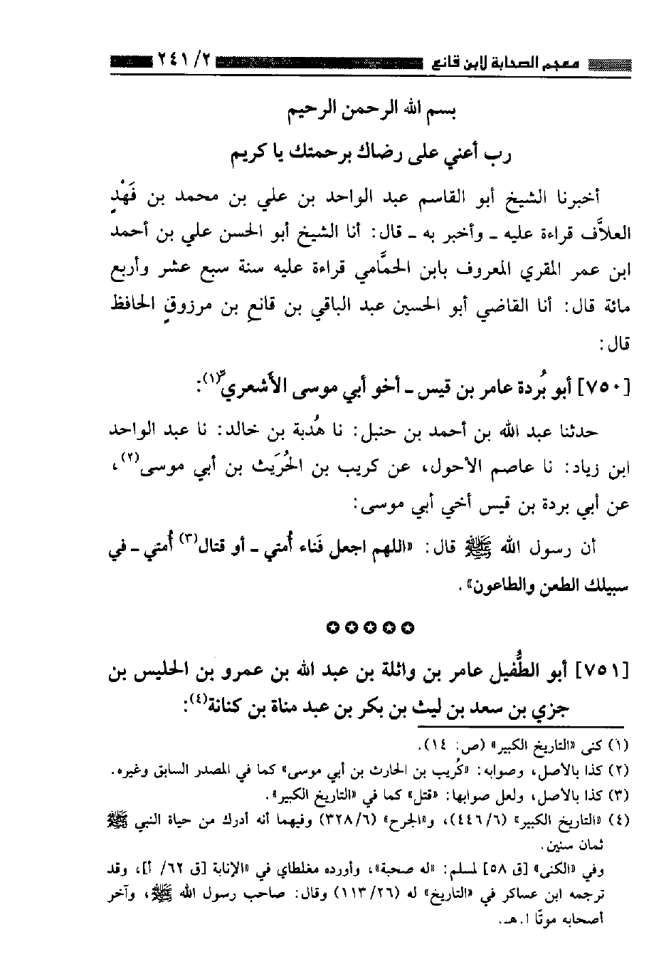 أَخْبَرَنَا الشَّيْخُ أَبُو الْقَاسِمِ عَبْدُ الْوَاحِدِ بْنُ عَلِيِّ بْنِ مُحَمَّدِ بْنِ فَهْدٍ الْعَلَّافُ، قِرَاءَةً عَلَيْهِ - وَأَخْبَرَ بِهِ - قَالَ: أنا الشَّيْخُ أَبُو الْحَسَنِ عَلِيُّ بْنُ أَحْمَدَ بْنِ عُمَرَ الْمُقْرِي الْمَعْرُوفُ بِابْنِ الْحَمَّامِيِّ قِرَاءَةً عَلَيْهِ سَنَةَ سَبْعَ عَشْرةَ وَأَرْبَعِمِائَةٍ، قَالَ: أنا الْقَاضِي أَبُو الْحُسَيْنِ عَبْدُ الْبَاقِي بْنُ قَانِعِ بْنِ مَرْزُوقٍ الْحَافِظُ قَالَ: حَدَّثَنَا عَبْدُ اللَّهِ بْنُ أَحْمَدَ بْنِ حَنْبَلٍ، نا هُدْبَةُ بْنُ خَالِدٍ، نا عَبْدُ الْوَاحِدِ بْنُ زِيَادٍ، نا عَاصِمٌ الْأَحْوَلُ، عَنْ كُرَيْبِ بْنِ الْحُرَيْثِ بْنِ أَبِي مُوسَى، عَنْ أَبِي بُرْدَةَ بْنِ قَيْسٍ، أَخِي أَبِي مُوسَى , أَنَّ رَسُولَ اللَّهِ صَلَّى اللهُ عَلَيْهِ وَسَلَّمَ قَالَ: «اللَّهُمَّ اجْعَلْ فَنَاءَ أُمَّتِي - أَوْ - قِتَالَ أُمَّتِي فِي سَبِيلِكِ الطَّعْنَ وَالطَّاعُونَ»