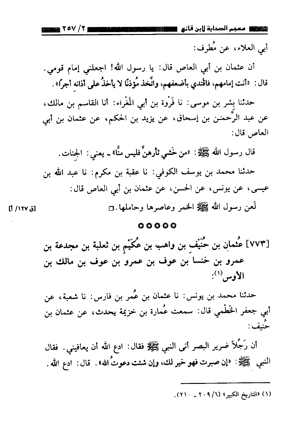 ٧٧٣ - عُثْمَانُ بْنُ حُنَيْفِ بْنِ وَاهِبِ بْنِ عُكَيْمِ بْنِ ثَعْلَبَةَ بْنِ مُجَدَّعَةَ بْنِ عَمْرِو بْنِ خَنْسَا بْنِ عَوْفِ بْنِ عَمْرِو بْنِ عَوْفِ بْنِ مَالِكِ بْنِ الْأَوْسِ