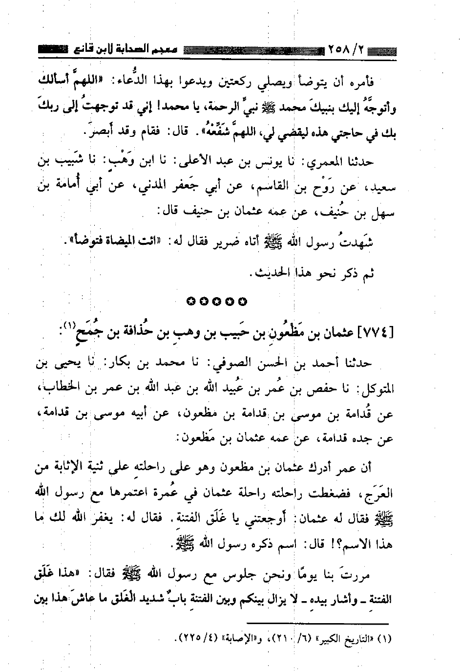 حَدَّثَنَا أَحْمَدُ بْنُ الْحَسَنِ الصُّوفِيُّ، نا مُحَمَّدُ بْنُ بَكَّارٍ، نا يَحْيَى بْنُ الْمُتَوَكِّلِ، نا حَفْصُ بْنُ عُمَرَ بْنِ عُبَيْدِ اللَّهِ بْنِ عَبْدِ اللَّهِ بْنِ عُمَرَ بْنِ الْخَطَّابِ، عَنْ قُدَامَةَ بْنِ مُوسَى بْنِ قُدَامَةَ بْنِ مَظْعُونٍ، عَنْ أَبِيهِ مُوسَى بْنِ قُدَامَةَ , عَنْ جَدِّهِ قُدَامَةَ , عَنْ عَمِّهِ عُثْمَانَ بْنِ مَظْعُونٍ , أَنَّ عُمَرَ، أَدْرَكَ عُثْمَانَ بْنَ مَظْعُونٍ وَهُوَ عَلَى رَاحِلَتِهِ عَلَى ثَنِيَّةِ الْإِثَابَةِ مِنَ الْعَرْجِ , فَضَغَطَتْ رَاحِلَتُهُ رَاحِلَةَ عُثْمَانَ فِي عُمْرَةٍ اعْتَمَرهَا مَعَ رَسُولِ اللَّهِ صَلَّى اللهُ عَلَيْهِ وَسَلَّمَ , فَقَالَ لَهُ عُثْمَانُ: أَوْجَعَتْنِي يَا غَلَقَ الْفِتْنَةِ فَقَالَ لَهُ: يَغْفِرُ اللَّهُ لَكَ , مَا هَذَا الِاسْمُ؟ قَالَ: اسْمٌ ذَكَرَهُ رَسُولُ اللَّهِ صَلَّى اللهُ عَلَيْهِ وَسَلَّمَ , مَرَرْتَ بِنَا يَوْمًا وَنَحْنُ جُلُوسٌ مَعَ رَسُولِ اللَّهِ صَلَّى اللهُ عَلَيْهِ وَسَلَّمَ , فَقَالَ: «هَذَا غَلَقُ الْفِتْنَةِ» , وَأَشَارَ بِيَدِهِ , «لَا يَزَالُ بَيْنَكُمْ وَبَيْنَ الْفِتْنَةِ بَابٌ شَدِيدُ الْغَلْقِ مَا عَاشَ هَذَا بَيْنَ