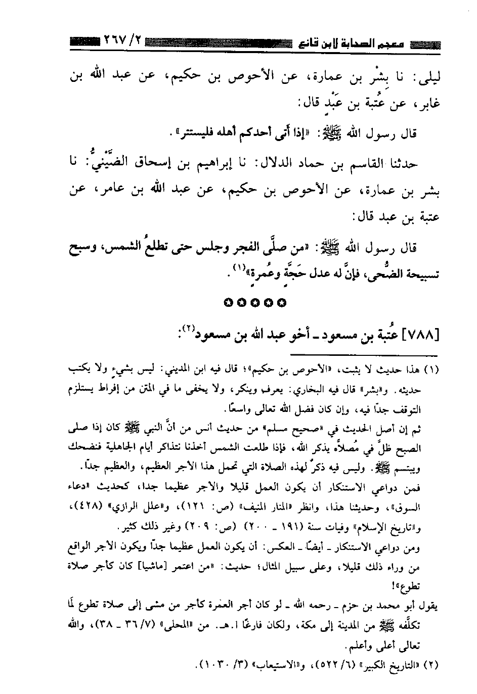 حَدَّثَنَا الْقَاسِمُ بْنُ حَمَّادٍ الدَّلَّالُ، نا إِبْرَاهِيمُ بْنُ إِسْحَاقَ الضَّيْنِيُّ، نا بِشْرُ بْنُ عُمَارَةَ، عَنِ الْأَحْوَصِ بْنِ حَكِيمٍ، عَنْ عَبْدِ اللَّهِ بْنِ غَابِرٍ، عَنْ عُتْبَةَ بْنِ عَبْدٍ قَالَ: قَالَ رَسُولُ اللَّهِ صَلَّى اللهُ عَلَيْهِ وَسَلَّمَ: «مَنْ صَلَّى الْفَجْرَ وَجَلَسَ حَتَّى تَطْلُعَ الشَّمْسُ وَسَبَّحَ تَسْبِيحَةَ الضُّحَى , فَإِنَّ لَهُ عَدْلَ حَجَّةٍ وَعُمْرَةٍ»