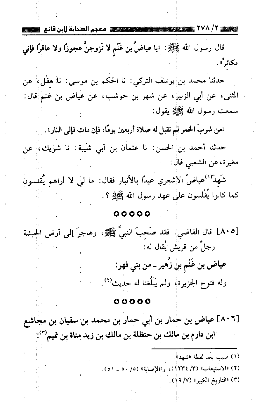 ٨٠٥ - قَالَ الْقَاضِي: فَقَدْ صَحِبَ النَّبِيَّ صَلَّى اللهُ عَلَيْهِ وَسَلَّمَ وَهَاجَرَ إِلَى أَرْضِ الْحَبَشَةِ رَجُلٌ مِنْ قُرَيْشٍ يُقَالُ لَهُ: عِيَاضُ بْنُ غَنْمِ بْنِ زُهَيْرٍ , مِنْ بَنِي فِهْرٍ , وَلَهُ فُتُوحُ الْجَزِيرَةِ , وَلَمْ يَبْلُغْنَا لَهُ حَدِيثٌ