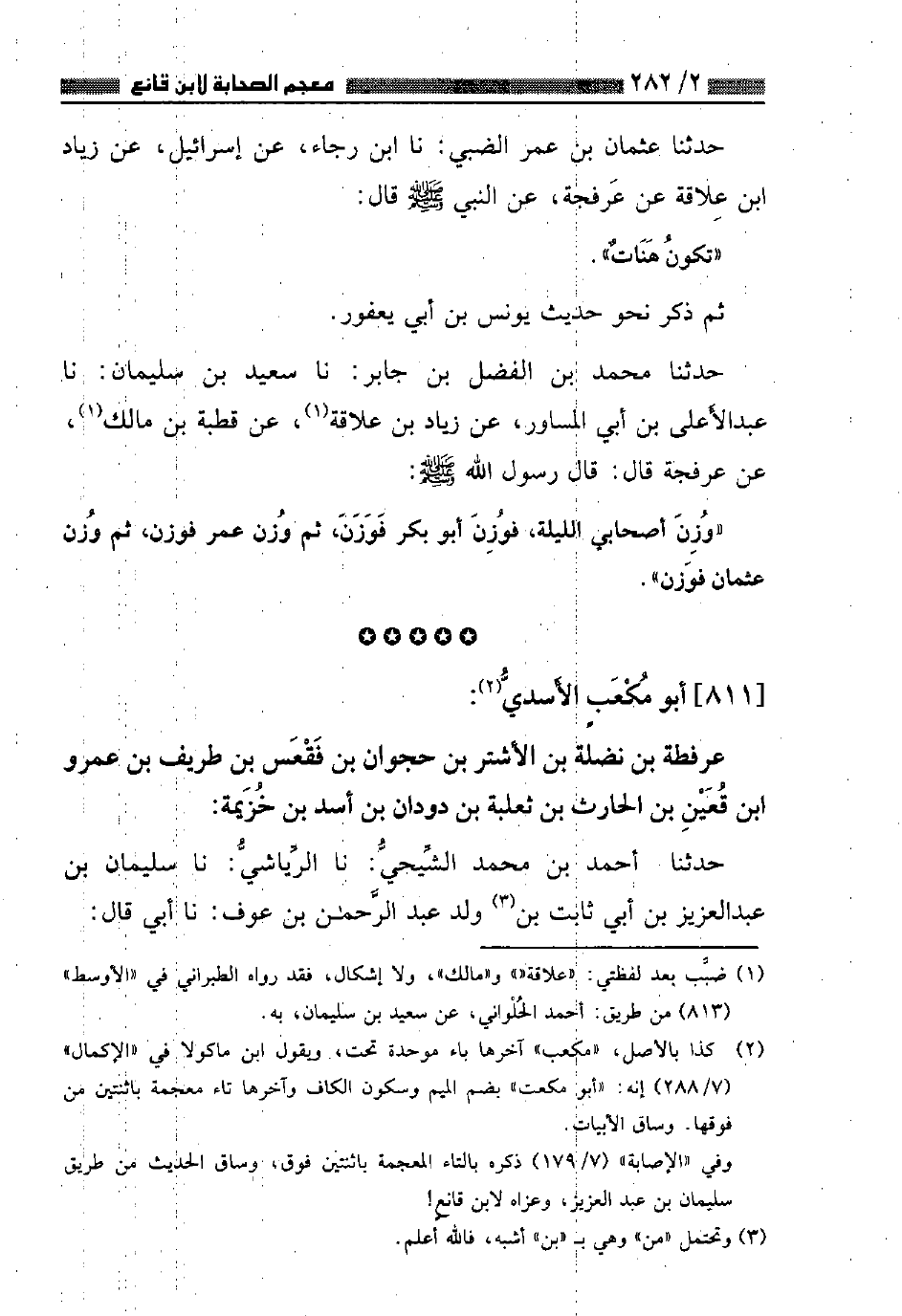 حَدَّثَنَا مُحَمَّدُ بْنُ الْفَضْلِ بْنِ جَابِرٍ، نا سَعِيدُ بْنُ سُلَيْمَانَ، نا عَبْدُ الْأَعْلَى بْنُ أَبِي الْمُسَاوِرِ، عَنْ زِيَادِ بْنِ عِلَاقَةَ، عَنْ قُطْبَةَ بْنِ مَالِكٍ، عَنْ عَرْفَجَةَ قَالَ: قَالَ رَسُولُ اللَّهِ صَلَّى اللهُ عَلَيْهِ وَسَلَّمَ: «وُزِنَ أَصْحَابِي اللَّيْلَةَ فَوُزِنَ أَبُو بَكْرٍ , فَوَزَنَ , ثُمَّ وُزِنَ عُمَرُ فَوَزَنَ , ثُمَّ وُزِنَ عُثْمَانُ فَوَزَنَ»