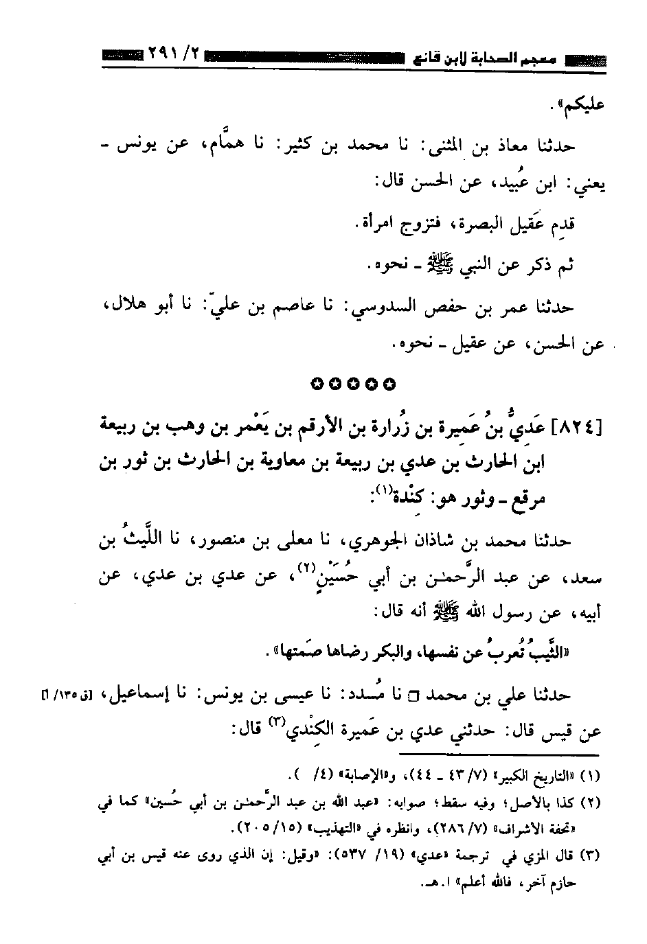 حَدَّثَنَا مُحَمَّدُ بْنُ شَاذَانَ الْجَوْهَرِيُّ، نا مُعَلَّى بْنُ مَنْصُورٍ، نا اللَّيْثُ بْنُ سَعْدٍ، عَنْ عَبْدِ الرَّحْمَنِ بْنِ أَبِي حُسَيْنٍ، عَنْ عَدِيِّ بْنِ عَدِيٍّ، عَنْ أَبِيهِ، عَنْ رَسُولِ اللَّهِ صَلَّى اللهُ عَلَيْهِ وَسَلَّمَ أَنَّهُ قَالَ: «الثَّيِّبُ تُعْرِبُ عَنْ نَفْسِهَا، وَالْبِكْرُ رِضَاهَا صَمْتُهَا»