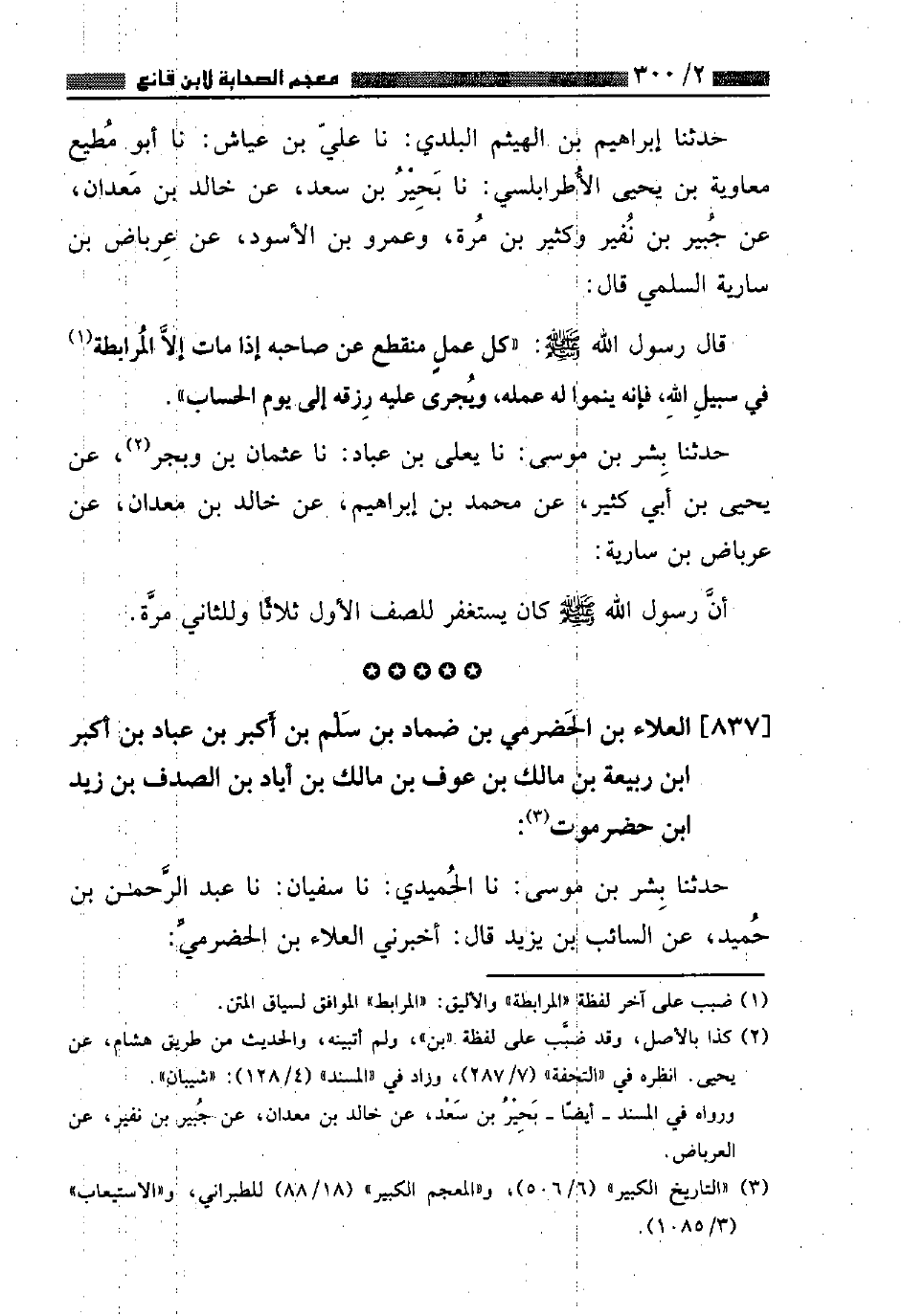 حَدَّثَنَا إِبْرَاهِيمُ بْنُ الْهَيْثَمِ الْبَلَدِيُّ، نا عَلِيُّ بْنُ عَيَّاشٍ، نا أَبُو مُطِيعٍ مُعَاوِيَةُ بْنُ يَحْيَى الْأَطْرَابُلْسِيُّ , نا بَحِيرُ بْنُ سَعْدٍ، عَنْ خَالِدِ بْنِ مَعْدَانَ، عَنْ جُبَيْرِ بْنِ نُفَيْرٍ، وَكَثِيرِ بْنِ مُرَّةَ، وَعَمْرِو بْنِ الْأَسْوَدِ، عَنْ عِرْبَاضِ بْنِ سَارِيَةَ السُّلَمِيِّ قَالَ: قَالَ رَسُولُ اللَّهِ صَلَّى اللهُ عَلَيْهِ وَسَلَّمَ: «كُلُّ عَمَلٍ مُنْقَطِعٌ عَنْ صَاحِبِهِ إِذَا مَاتَ , إِلَّا الْمُرَابَطَةَ فِي سَبِيلِ اللَّهِ , فَإِنَّهُ يَنْمُو لَهُ عَمَلُهُ , وَيُجْرَى عَلَيْهِ رِزْقُهُ إِلَى يَوْمِ الْحِسَابِ»