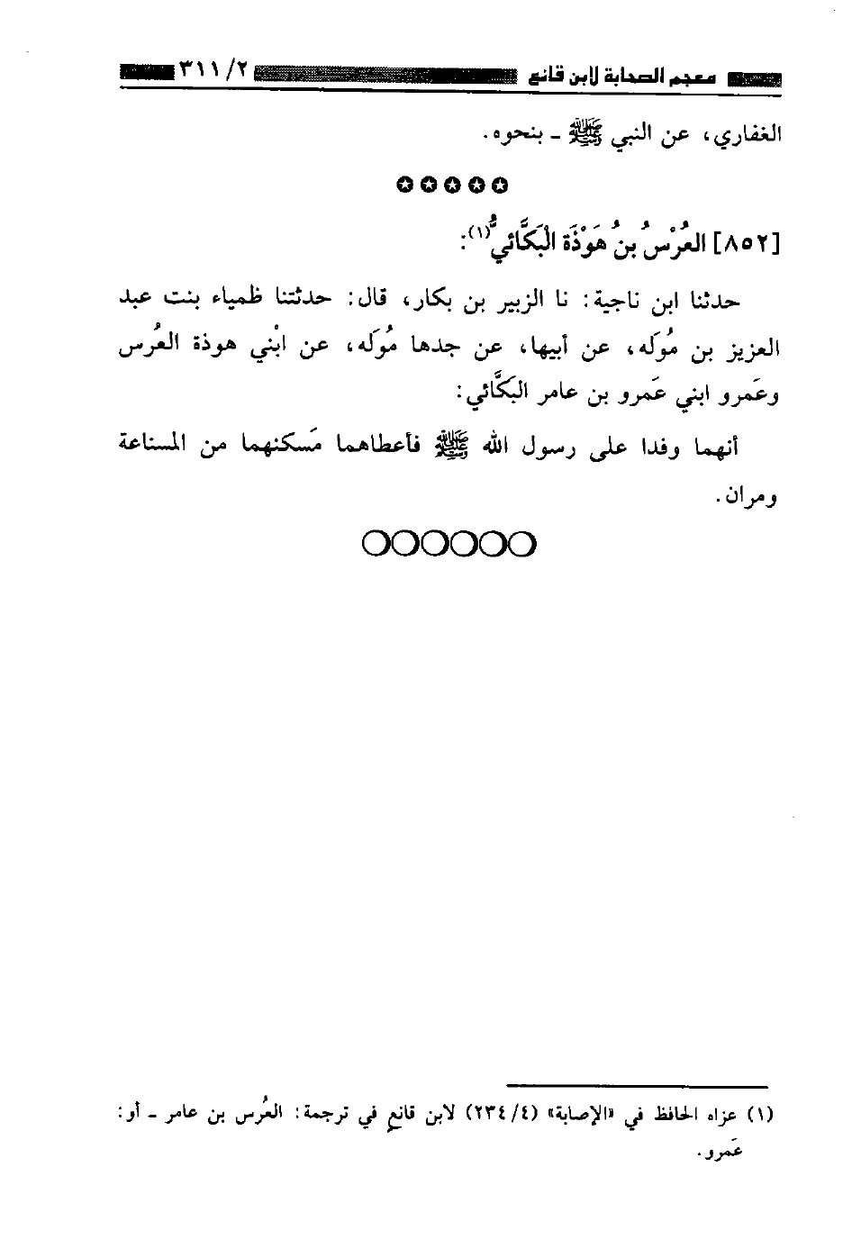 ٨٥٢ - الْعُرْسُ بْنُ هَوْذَةَ الْبَكَّائِيُّ