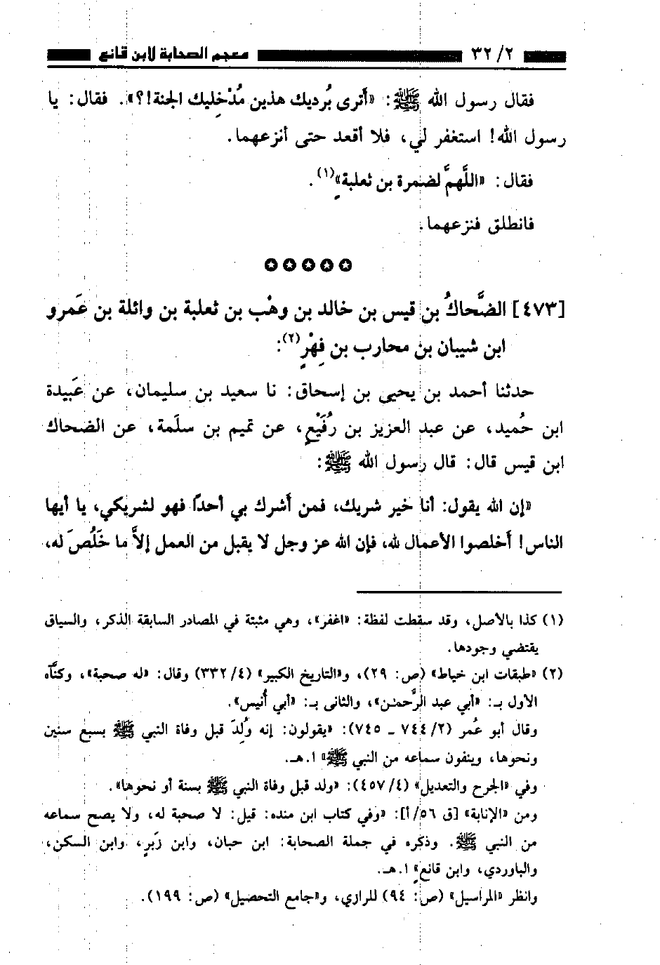 ٤٧٣ - الضَّحَّاكُ بْنُ قَيْسِ بْنِ خَالِدِ بْنِ وَهْبِ بْنِ ثَعْلَبَةَ بْنِ وَائِلَةَ بْنِ عَمْرِو بْنِ شَيْبَانَ بْنِ مُحَارِبِ بْنِ فِهْرٍ