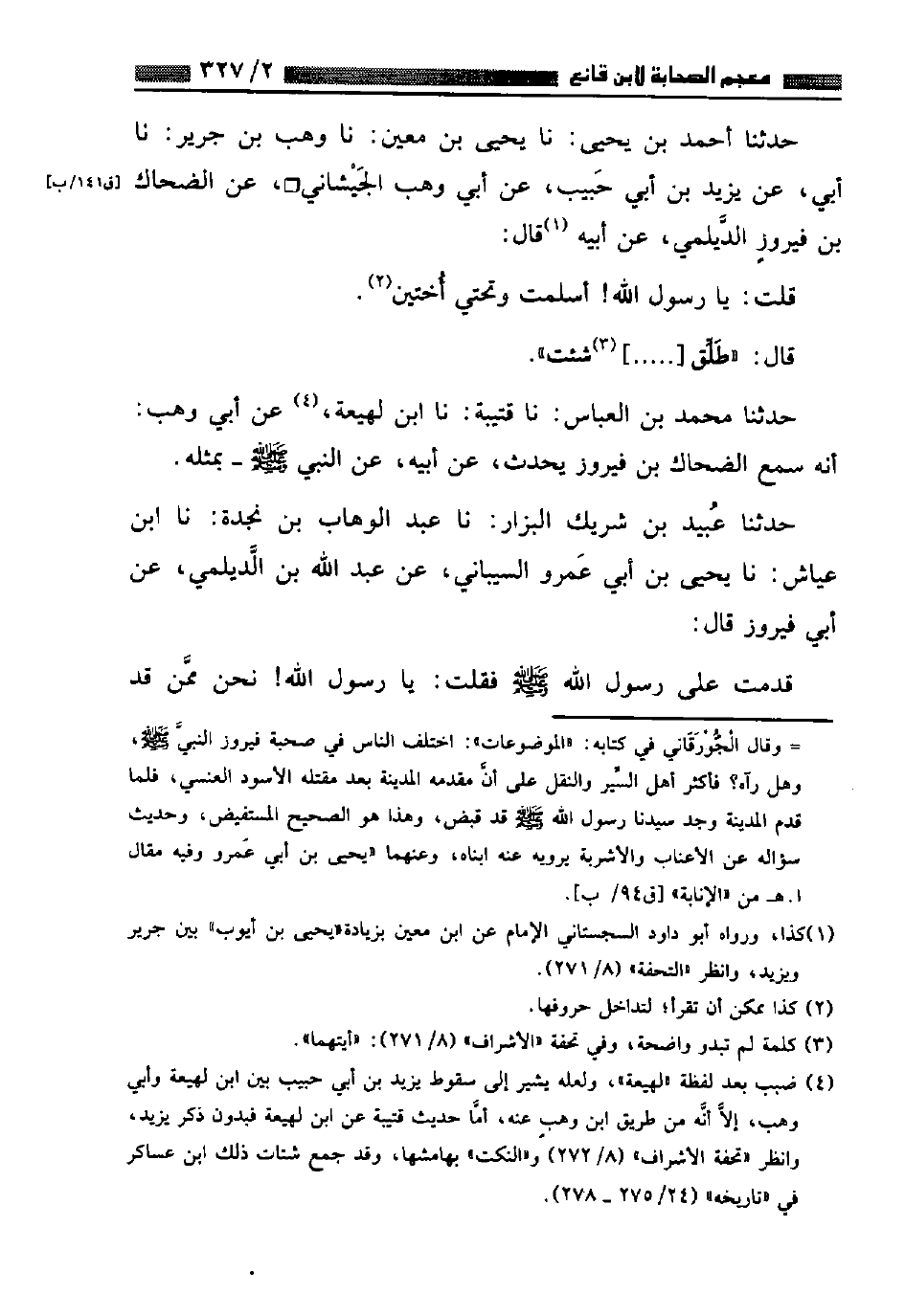 حَدَّثَنَا أَحْمَدُ بْنُ يَحْيَى، نا يَحْيَى بْنُ مَعِينٍ، نا وَهْبُ بْنُ جَرِيرٍ، نا أَبِي، عَنْ يَزِيدَ بْنِ أَبِي حَبِيبٍ، عَنْ أَبِي وَهْبٍ الْجَيْشَانِيِّ، عَنِ الضَّحَّاكِ بْنِ فَيْرُوزَ الدَّيْلَمِيِّ، عَنْ أَبِيهِ قَالَ: قُلْتُ: يَا رَسُولَ اللَّهِ , أَسْلَمْتُ وَتَحْتِي أُخْتَانِ قَالَ: «طَلِّقْ أَيَّتَهُمَا شِئْتَ» حَدَّثَنَا مُحَمَّدُ بْنُ الْعَبَّاسِ، نا قُتَيْبَةُ، نا ابْنُ لَهِيعَةَ، عَنْ أَبِي وَهْبٍ، أَنَّهُ سَمِعَ الضَّحَّاكَ بْنَ فَيْرُوزَ، يُحَدِّثُ , عَنْ أَبِيهِ عَنِ النَّبِيِّ صَلَّى اللهُ عَلَيْهِ وَسَلَّمَ بِمِثْلِهِ