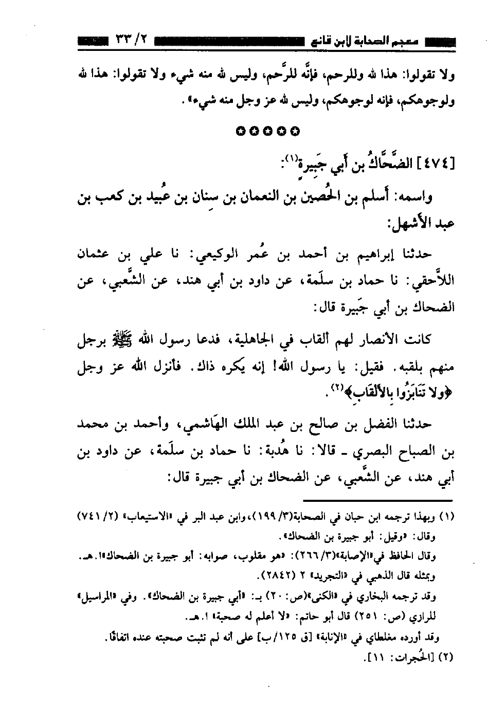 ٤٧٤ - الضَّحَّاكُ بْنُ أَبِي جَبِيرَةَ وَاسْمُهُ أَسْلَمُ بْنُ الْحُصَيْنِ بْنِ النُّعْمَانِ بْنِ سِنَانِ بْنِ عُبَيْدِ بْنِ كَعْبِ بْنِ عَبْدِ الْأَشْهَلِ