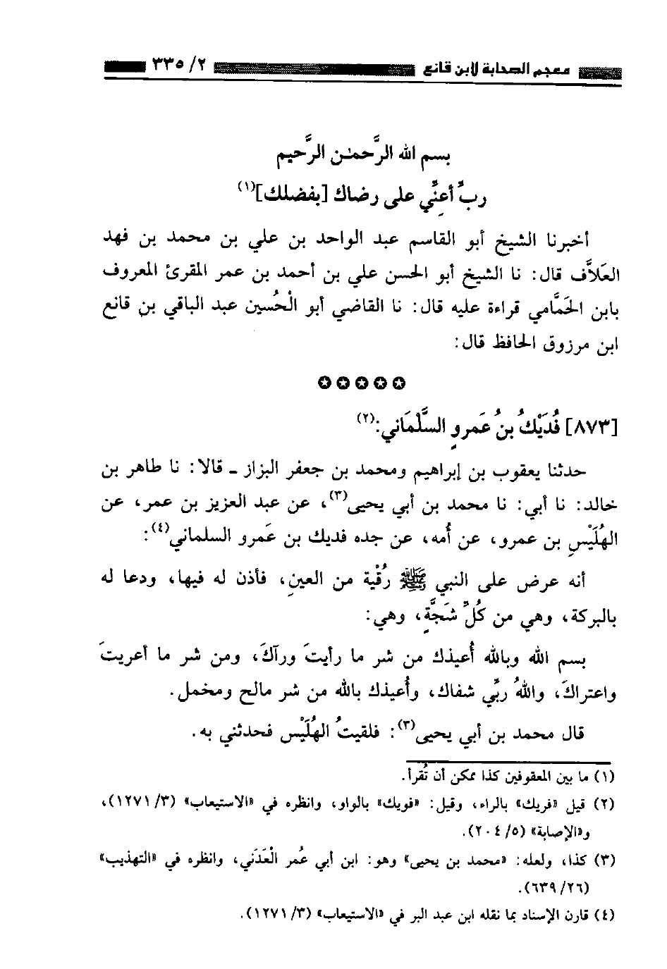 ٨٧٣ - حَدَّثَنَا يَعْقُوبُ بْنُ إِبْرَاهِيمَ، وَمُحَمَّدُ بْنُ جَعْفَرٍ الْبَزَّازُ قَالَا: نا طَاهِرُ بْنُ خَالِدٍ، نا أَبِي، نا مُحَمَّدُ بْنُ أَبِي يَحْيَى، عَنْ عَبْدِ الْعَزِيزِ بْنِ عُمَرَ، عَنِ الْهُلَيْسِ بْنِ عَمْرٍو، عَنْ أُمِّهِ، عَنْ جَدِّهِ فُدَيْكِ بْنِ عَمْرٍو السَّلْمَانِيِّ أَنَّهُ «عَرَضَ عَلَى النَّبِيِّ صَلَّى اللهُ عَلَيْهِ وَسَلَّمَ رُقْيَةً مِنَ الْعَيْنِ , فَأَذِنَ لَهُ فِيهَا , وَدَعَا لَهُ بِالْبَرَكَةِ» وَهِيَ مِنْ كُلِّ شَجَّةٍ , وَهِيَ: «بِسْمِ اللَّهِ , وَبِاللَّهِ أُعِيذُكَ مِنْ شَرِّ مَا رَأَيْتَ وَرَآكَ , وَمِنْ شَرِّ مَا أَعْرَيْتَ وَاعْتَرَاكَ , وَاللَّهُ رَبِّي شَفَاكَ , وَأُعِيذُكَ بِاللَّهِ مِنْ شَرِّ مَالِحٍ وَمُخْمَلٍ» قَالَ مُحَمَّدُ بْنُ أَبِي يَحْيَى: فَلَقِيتُ الْهُلَيْسَ فَحَدَّثَنِي بِهِ