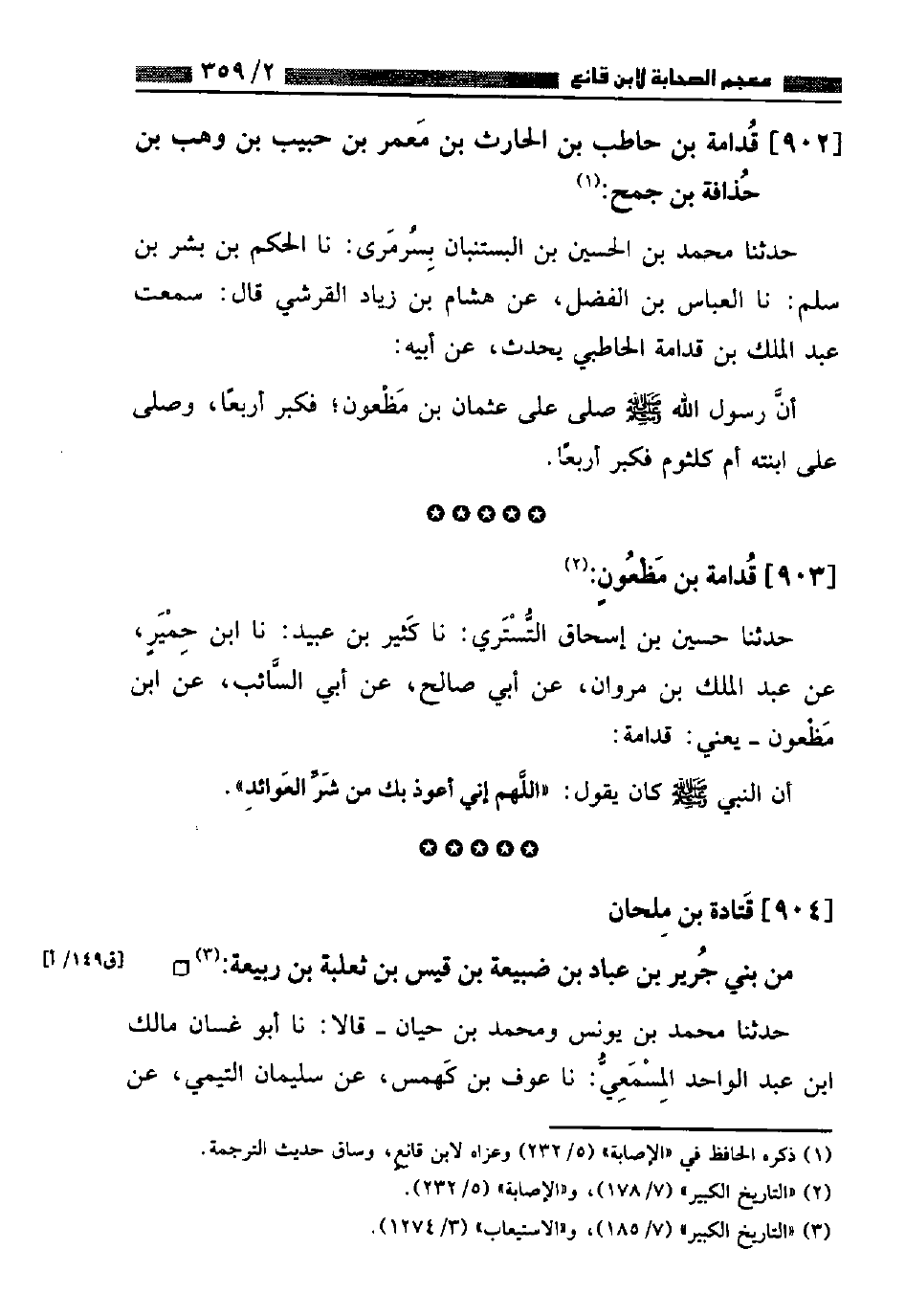 ٩٠٢ - قُدَامَةُ بْنُ حَاطِبِ بْنِ الْحَارِثِ بْنِ مَعْمَرٍ بْنِ حَبِيبِ بْنِ وَهْبِ بْنِ حُذَافَةَ بْنِ جُمَحٍ