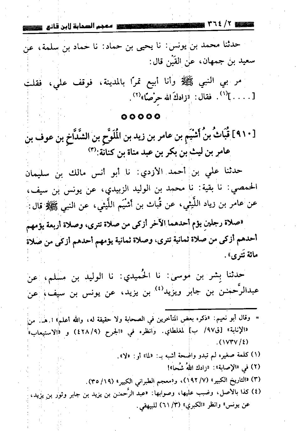 حَدَّثَنَا عَلِيُّ بْنُ أَحْمَدَ الْأَزْدِيُّ، نا أَبُو أَنَسٍ مَالِكُ بْنُ سُلَيْمَانَ الْحِمْصِيُّ , نا بَقِيَّةُ، نا مُحَمَّدُ بْنُ الْوَلِيدِ الزُّبَيْدِيُّ، عَنْ يُونُسَ بْنِ سَيْفٍ، عَنْ عَامِرِ بْنِ زِيَادٍ اللَّيْثِيِّ، عَنْ قُبَاثِ بْنِ أَشْيَمَ اللَّيْثِيِّ عَنِ النَّبِيِّ صَلَّى اللهُ عَلَيْهِ وَسَلَّمَ قَالَ: «صَلَاةُ رَجُلَيْنِ يَؤُمُّ أَحَدُهُمَا الْآخَرَ أَزْكَى مِنْ صَلَاةٍ تَتْرَى , وَصَلَاةُ أَرْبَعَةٍ يَؤُمُّهُمْ أَحَدُهُمْ أَزْكَى مِنْ صَلَاةِ ثَمَانِيَةٍ تَتْرَى , وَصَلَاةُ ثَمَانِيَةٍ يَؤُمُّهُمْ أَحَدُهُمْ أَزْكَى مِنْ صَلَاةِ مِائَةٍ تَتْرَى» حَدَّثَنَا بِشْرُ بْنُ مُوسَى، نا الْحُمَيْدِيُّ، نا الْوَلِيدُ بْنُ مُسْلِمٍ، عَنْ عَبْدِ الرَّحْمَنِ بْنِ جَابِرٍ، وَيَزِيدَ بْنِ يَزِيدَ، عَنْ يُونُسَ بْنِ سَيْفٍ، عَنْ ⦗٣٦٥⦘ قُبَاثٍ عَنِ النَّبِيِّ صَلَّى اللهُ عَلَيْهِ وَسَلَّمَ بِنَحْوِهِ , وَلَمْ يَذْكُرْ فِي الْإِسْنَادِ عَامِرَ بْنَ زِيَادٍ