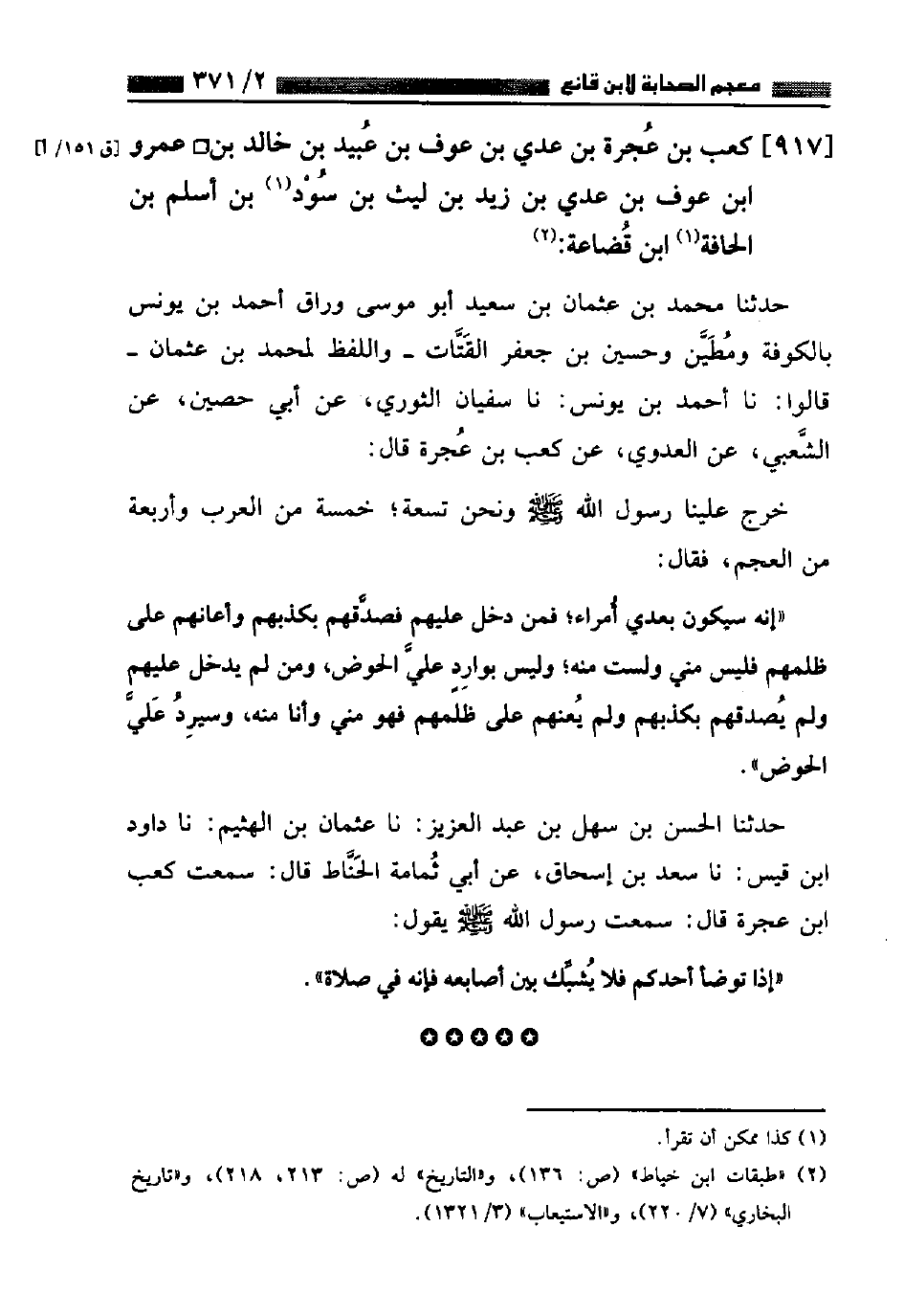 حَدَّثَنَا مُحَمَّدُ بْنُ عُثْمَانَ بْنِ سَعِيدٍ أَبُو مُوسَى وَرَّاقُ أَحْمَدَ بْنِ يُونُسَ بِالْكُوفَةِ , وَمُطَيَّنٌ , وَحُسَيْنُ بْنُ جَعْفَرٍ الْقَتَّاتُ وَاللَّفْظُ لِمُحَمَّدِ بْنِ عُثْمَانَ قَالُوا: نا أَحْمَدُ بْنُ يُونُسَ، نا سُفْيَانُ الثَّوْرِيُّ، عَنْ أَبِي حُصَيْنٍ، عَنِ الشَّعْبِيِّ، عَنِ الْعَدَوِيِّ، عَنْ كَعْبِ بْنِ عُجْرَةَ قَالَ: خَرَجَ عَلَيْنَا رَسُولُ اللَّهِ صَلَّى اللهُ عَلَيْهِ وَسَلَّمَ وَنَحْنُ تِسْعَةٌ , خَمْسَةٌ مِنَ الْعَرَبِ , وَأَرْبَعَةٌ مِنَ الْعَجَمِ , فَقَالَ: «إِنَّهُ سَيَكُونُ بَعْدِي أُمَرَاءُ , فَمَنْ دَخَلَ عَلَيْهِمْ فَصَدَّقَهُمْ بِكَذِبِهِمْ , وَأَعَانَهُمْ عَلَى ظُلْمِهِمْ فَلَيْسَ مِنِّي , وَلَسْتُ مِنْهُ , وَلَيْسَ بِوَارِدٍ عَلَيَّ الْحَوْضَ , وَمَنْ لَمْ يَدْخُلْ عَلَيْهِمْ , وَلَمْ يُصَدِّقْهُمْ بِكَذِبِهِمْ , وَلَمْ يُعِنْهُمْ عَلَى ظُلْمِهِمْ فَهُوَ مِنِّي , وَأَنَا مِنْهُ , وَسَيَرِدُ عَلَيَّ الْحَوْضَ»