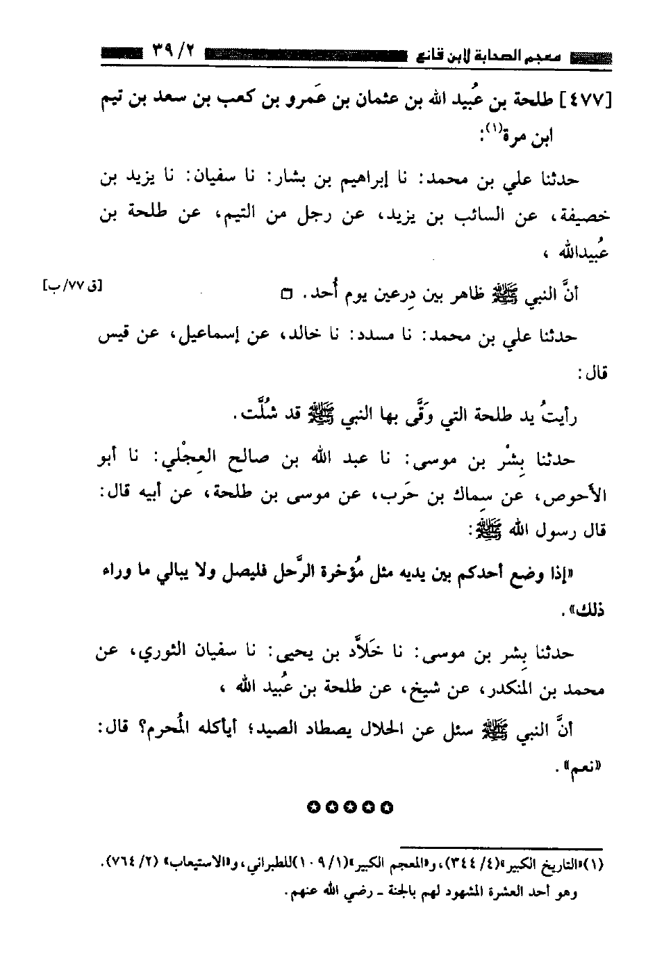 ٤٧٧ - طَلْحَةُ بْنُ عُبَيْدِ اللَّهِ بْنِ عُثْمَانَ بْنِ عَمْرِو بْنِ كَعْبِ بْنِ سَعْدِ بْنِ تَيْمِ بْنِ مُرَّةَ