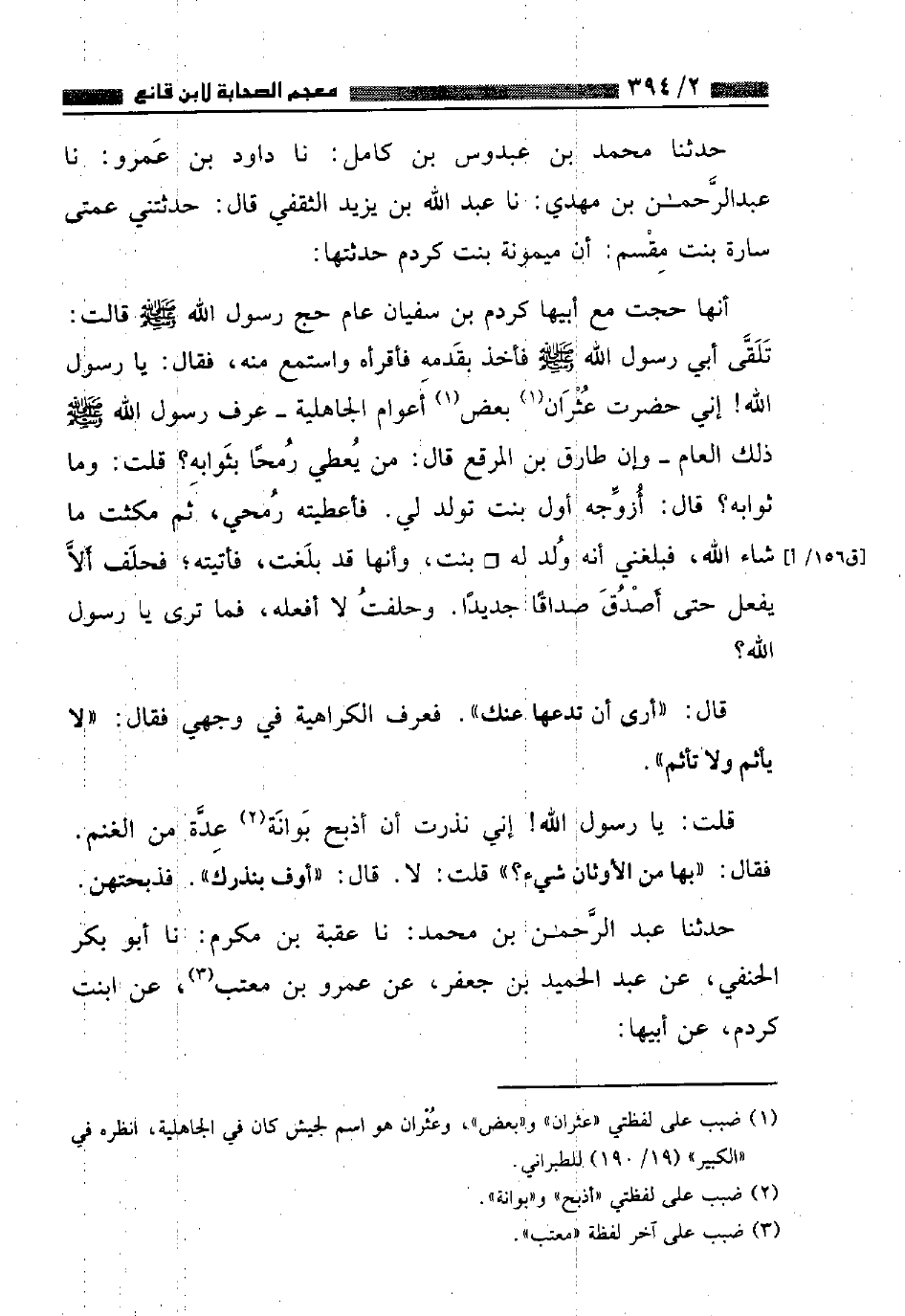 حَدَّثَنَا مُحَمَّدُ بْنُ عَبْدُوسِ بْنِ كَامِلٍ، نا دَاوُدُ بْنُ عَمْرٍو، نا عَبْدُ الرَّحْمَنِ بْنُ مَهْدِيٍّ، نا عَبْدُ اللَّهِ بْنُ يَزِيدَ الثَّقَفِيُّ قَالَ: حَدَّثَتْنِي عَمَّتِي سَارَةُ بِنْتُ مِقْسَمٍ أَنَّ مَيْمُونَةَ بِنْتَ كَرْدَمٍ حَدَّثَتْهَا أَنَّهَا، حَجَّتْ مَعَ أَبِيهَا كَرْدَمِ بْنِ سُفْيَانَ عَامَ حَجِّ رَسُولِ اللَّهِ صَلَّى اللهُ عَلَيْهِ وَسَلَّمَ قَالَتْ: تَلَقَّى أَبِي رَسُولَ اللَّهِ صَلَّى اللهُ عَلَيْهِ وَسَلَّمَ , فَأَخَذَ بِقَدَمِهِ , فَأَقْرَأَهُ , وَاسْتَمَعَ مِنْهُ , فَقَالَ: يَا رَسُولَ اللَّهِ , إِنِّي حَضَرْتُ عُثْرَانَ بَعْضَ أَعْوَامِ الْجَاهِلِيَّةِ , عَرَفَ رَسُولُ اللَّهِ صَلَّى اللهُ عَلَيْهِ وَسَلَّمَ ذَلِكَ الْعَامَ , وَإِنَّ طَارِقَ بْنَ الْمُرَقَّعِ قَالَ: مَنْ يُعْطِي رُمْحًا بِثَوَابِهِ؟ قُلْتُ: وَمَا ثَوَابُهُ؟ قَالَ: أُزَوِّجُهُ أَوَّلَ بِنْتٍ تُولَدُ لِي , فَأَعْطَيْتُهُ رُمْحِي , ثُمَّ مَكَثْتُ مَا شَاءَ اللَّهُ , فَبَلَغَنِي أَنَّهُ وُلِدَ لَهُ بِنْتٌ , وَأَنَّهَا قَدْ بَلَغَتْ , فَأَتَيْتُهُ , فَحَلَفَ أَلَّا يَفْعَلَ حَتَّى أَصْدُقَ صَدَاقًا جَدِيدًا , وَحَلَفْتُ لَا أَفْعَلُهُ , فَمَا تَرَى يَا رَسُولَ اللَّهِ؟ قَالَ: «أَرَى أَنْ تَدَعَهَا عَنْكَ» , فَعَرَفَ الْكَرَاهِيَةَ فِي وَجْهِي , فَقَالَ: «لَا يَأْثَمُ , وَلَا تَأْثَمُ» , قُلْتُ: يَا رَسُولَ اللَّهِ , إِنِّي نَذَرْتُ أَنْ أَذْبَحَ بُوَانَةَ عِدَّةً مِنَ الْغَنَمِ , فَقَالَ: «بِهَا مِنَ الْأَوْثَانِ شَيْءٌ؟» قُلْتُ: لَا قَالَ: «أَوْفِ بِنَذْرِكَ» , فَذَبَحْتُهُنَّ