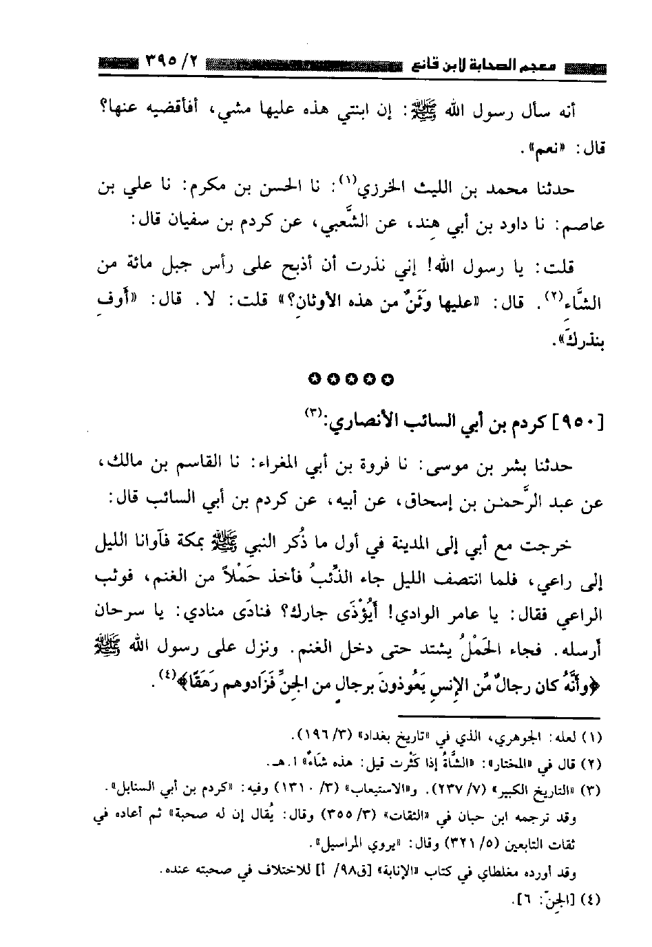 حَدَّثَنَا مُحَمَّدُ بْنُ اللَّيْثِ الْخَرَزِيُّ، نا الْحَسَنُ بْنُ مُكْرَمٍ، نا عَلِيُّ بْنُ عَاصِمٍ، نا دَاوُدُ بْنُ أَبِي هِنْدَ، عَنِ الشَّعْبِيِّ، عَنْ كَرْدَمِ بْنِ سُفْيَانَ قَالَ: قُلْتُ: يَا رَسُولَ اللَّهِ , إِنِّي نَذَرْتُ أَنْ أَذْبَحَ عَلَى رَأْسِ جَبَلٍ مِائَةً مِنَ الشَّاءِ قَالَ: «عَلَيْهَا وَثَنٌ مِنْ هَذِهِ الْأَوْثَانِ؟» , قُلْتُ: لَا قَالَ: «أَوْفِ بِنَذْرِكَ»
