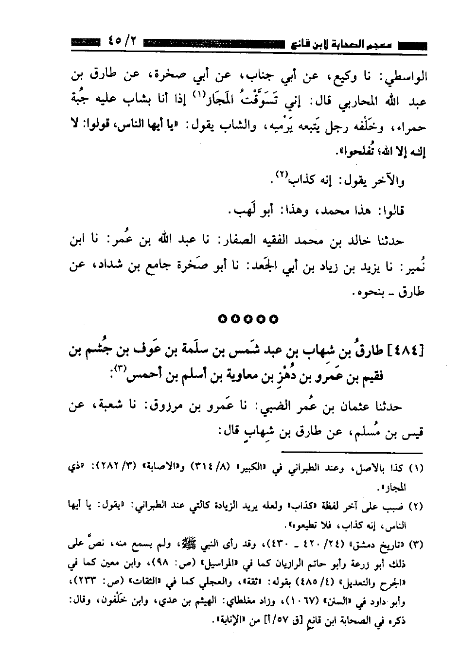 ٤٨٤ - طَارِقُ بْنُ شِهَابِ بْنِ عَبْدِ شَمْسِ بْنِ سَلَمَةَ بْنِ عَوْفِ بْنِ جُشَمِ بْنِ فُقَيْمِ بْنِ عَمْرِو بْنِ دُهْزِ بْنِ مُعَاوِيَةَ بْنِ أَسْلَمَ بْنِ أَحْمَسَ