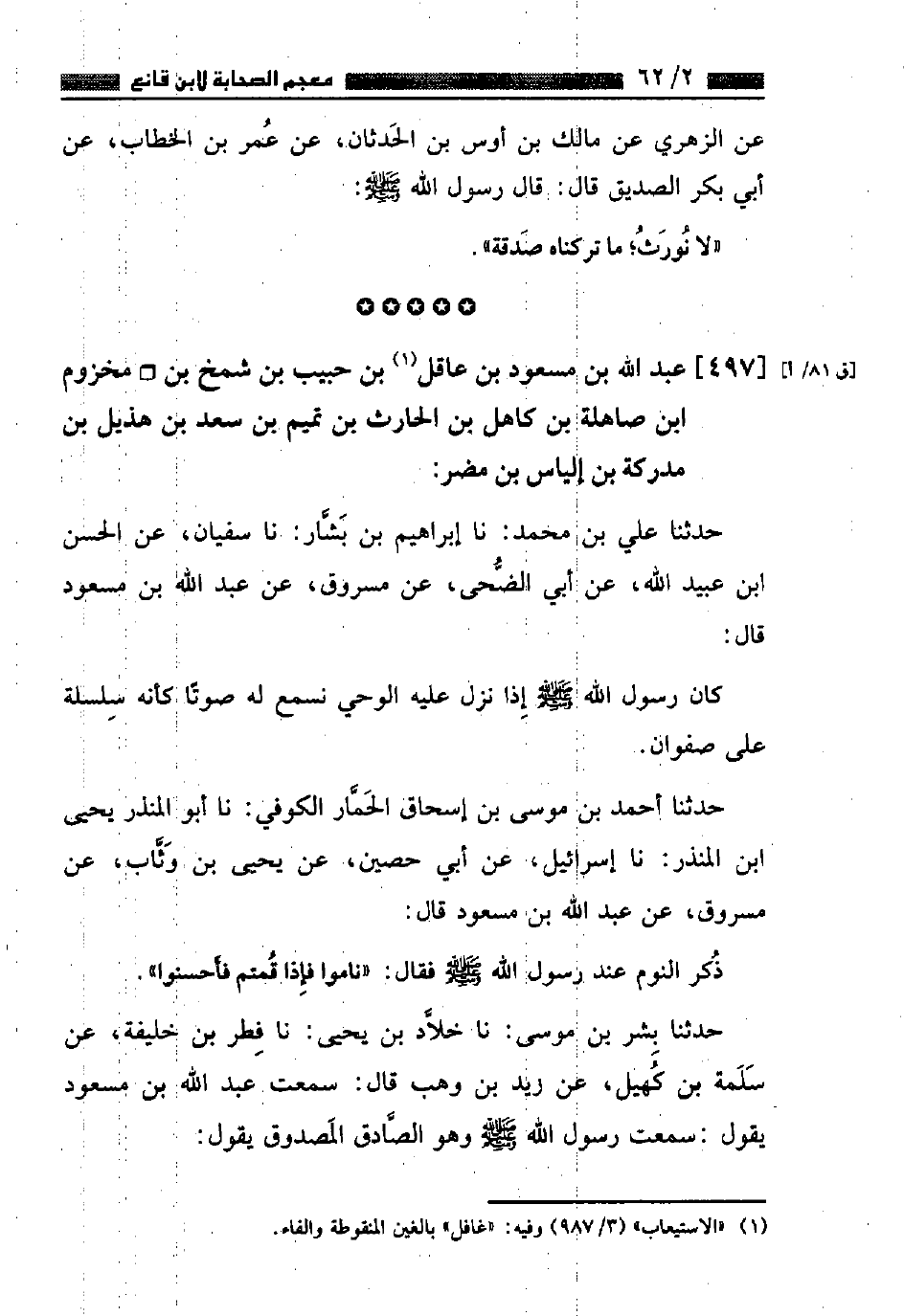 ٤٩٧ - عَبْدُ اللَّهِ بْنُ مَسْعُودِ بْنِ عَاقِلِ بْنِ حَبِيبِ بْنِ شَمْخِ بْنِ مَخْزُومِ بْنِ صَاهِلَةَ بْنِ كَاهِلِ بْنِ الْحَارِثِ بْنِ تَمِيمِ بْنِ سَعْدِ بْنِ هُذَيْلِ بْنِ مُدْرِكَةَ بْنِ إِلْيَاسِ بْنِ مُضَرَ