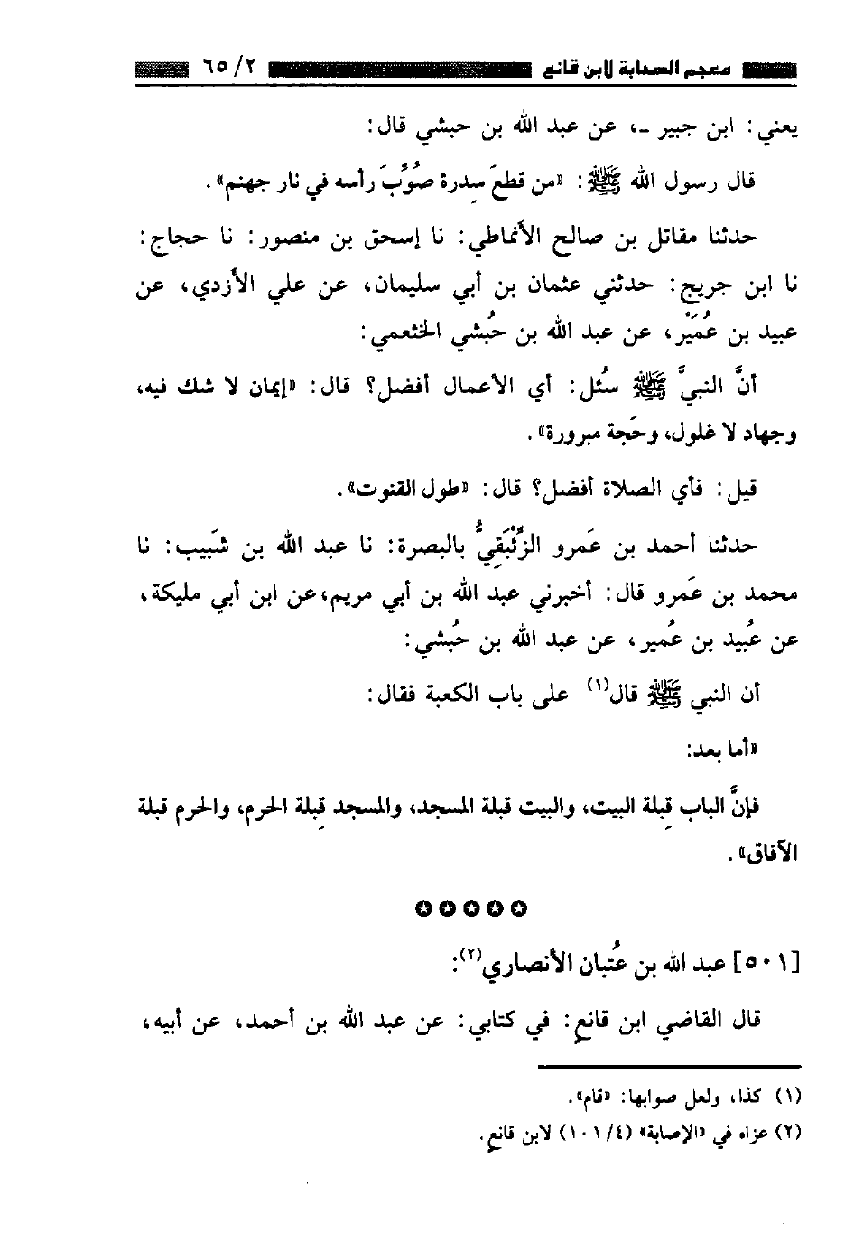 حَدَّثَنَا مُقَاتِلُ بْنُ صَالِحٍ الْأَنْمَاطِيُّ، نا إِسْحَاقُ بْنُ مَنْصُورٍ، نا حَجَّاجٌ، نا ابْنُ جُرَيْجٍ، حَدَّثَنِي عُثْمَانُ بْنُ أَبِي سُلَيْمَانَ، عَنْ عَلِيٍّ الْأَزْدِيِّ، عَنْ عُبَيْدِ بْنِ عُمَيْرٍ , عَنْ عَبْدِ اللَّهِ بْنِ حُبْشِيٍّ الْخَثْعَمِيِّ أَنَّ النَّبِيَّ صَلَّى اللهُ عَلَيْهِ وَسَلَّمَ سُئِلَ: أَيُّ الْأَعْمَالِ أَفْضَلُ؟ قَالَ: «إِيمَانٌ لَا شَكَّ فِيهِ , وَجِهَادٌ لَا غُلُولَ , وَحَجَّةٌ مَبْرُورَةٌ» , قِيلَ: فَأَيُّ الصَّلَاةِ أَفْضَلُ؟ قَالَ: «طُولُ الْقُنُوتِ»