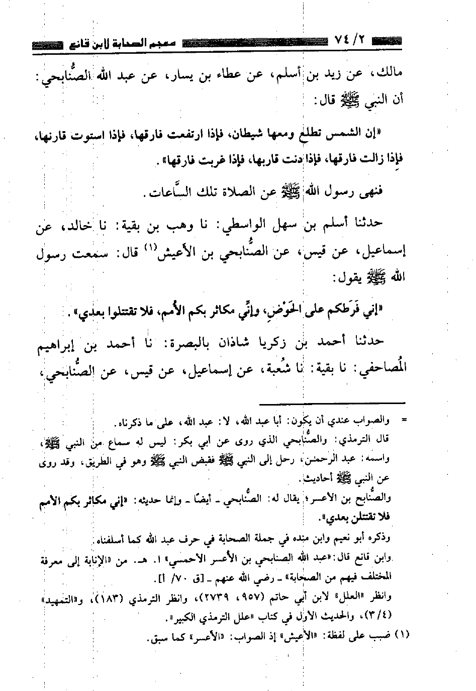 حَدَّثَنَا أَسْلَمُ بْنُ سَهْلٍ الْوَاسِطِيُّ، نا وَهْبُ بْنُ بَقِيَّةَ، نا خَالِدٌ، عَنْ إِسْمَاعِيلَ، عَنْ قَيْسٍ، عَنِ الصُّنَابِحِيِّ بْنِ الأعْسر قَالَ: سَمِعْتُ رَسُولَ اللَّهِ صَلَّى اللهُ عَلَيْهِ وَسَلَّمَ يَقُولُ: «إِنِّي فَرَطُكُمْ عَلَى الْحَوْضِ , وَإِنِّي مُكَاثِرٌ بِكُمُ الْأُمَمَ , فَلَا تَقْتَتِلُوا بَعْدِي» حَدَّثَنَا أَحْمَدُ بْنُ زَكَرِيَّا شَاذَانُ بِالْبَصْرَةِ , نا أَحْمَدُ بْنُ إِبْرَاهِيمَ الْمَصَاحِفِيُّ، نا بَقِيَّةُ، نا شُعْبَةُ، عَنْ إِسْمَاعِيلَ، عَنْ قَيْسٍ، عَنِ الصُّنَابِحِيِّ ⦗٧٥⦘ عَنِ النَّبِيِّ صَلَّى اللهُ عَلَيْهِ وَسَلَّمَ بِمِثْلِهِ