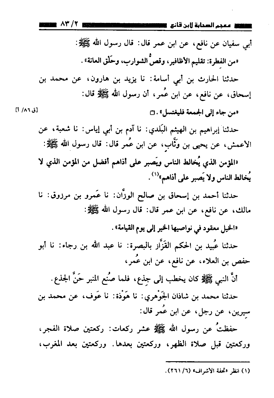 حَدَّثَنَا إِبْرَاهِيمُ بْنُ الْهَيْثَمِ الْبَلَدِيُّ، نا آدَمُ بْنُ أَبِي إِيَاسٍ، نا شُعْبَةُ، عَنِ الْأَعْمَشِ، عَنْ يَحْيَى بْنِ وَثَّابٍ، عَنِ ابْنِ عُمَرَ قَالَ: قَالَ رَسُولُ اللَّهِ صَلَّى اللهُ عَلَيْهِ وَسَلَّمَ: «الْمُؤْمِنُ الَّذِي يُخَالِطُ النَّاسَ وَيَصْبِرُ عَلَى أَذَاهُمْ , أَفْضَلُ مِنَ الْمُؤْمِنِ الَّذِي لَا يُخَالِطُ النَّاسَ وَلَا يَصْبِرُ عَلَى أَذَاهُمْ»