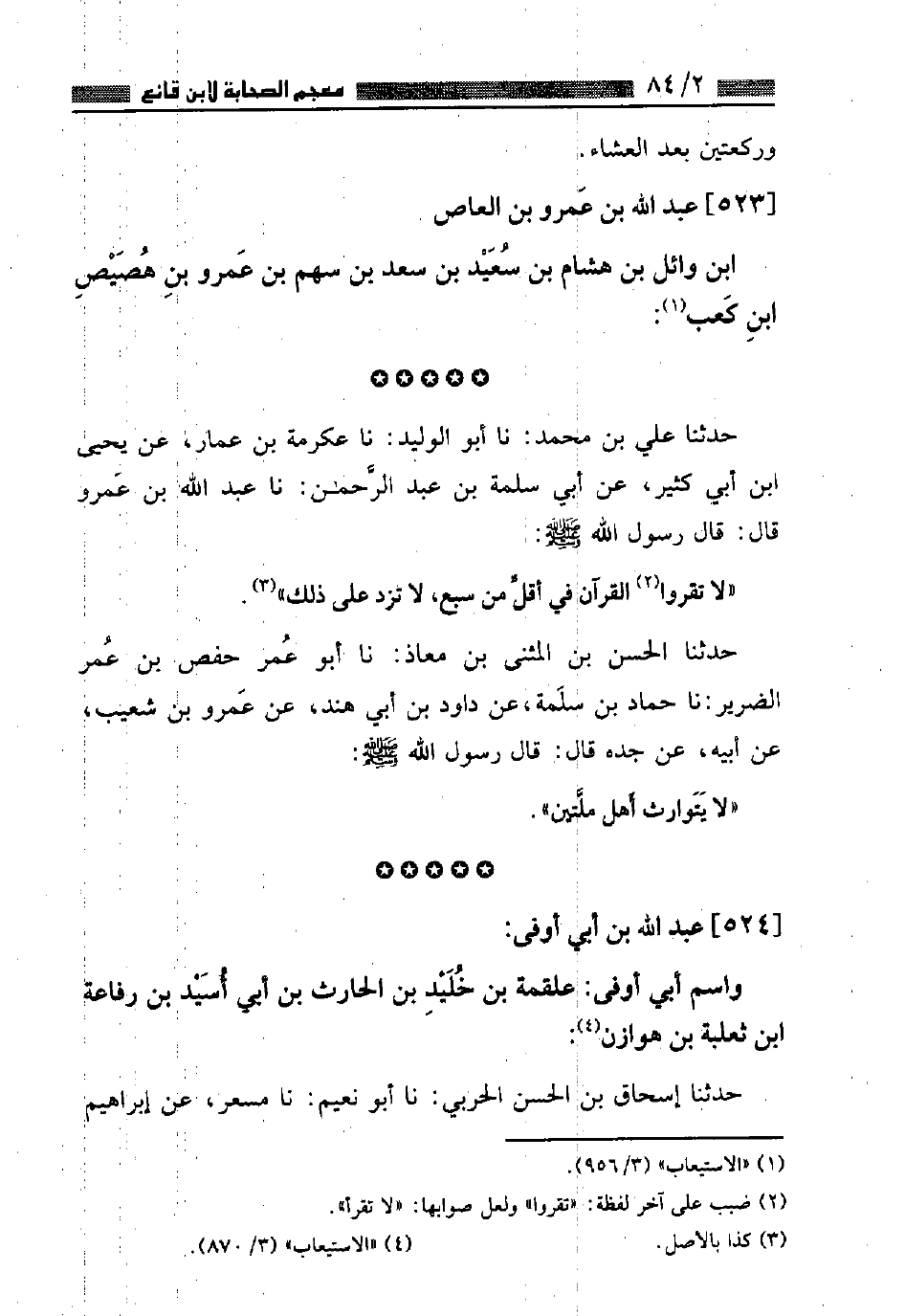 ٥٢٣ - عَبْدُ اللَّهِ بْنُ عَمْرِو بْنِ الْعَاصِ بْنِ وَائِلِ بْنِ هِشَامِ بْنِ سَعِيدِ بْنِ سَعْدِ بْنِ سَهْمِ بْنِ عَمْرِو بْنِ هُصَيْصِ بْنِ كَعْبٍ