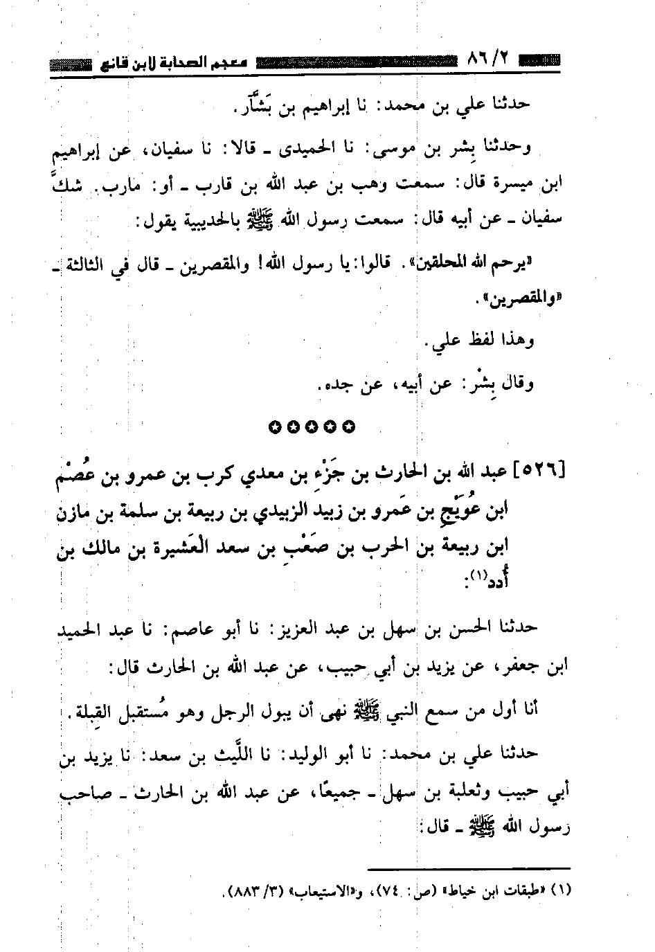 ٥٢٦ - عَبْدُ اللَّهِ بْنُ الْحَارِثِ بْنِ جَزْءِ بْنِ مَعْدِي كَرِبِ بْنِ عَمْرِو بْنِ عُصْمِ بْنِ عُوَيْجِ بْنِ عَمْرِو بْنِ زُبَيْدٍ الزُّبَيْدِيُّ بْنِ رَبِيعَةَ بْنِ سَلَمَةَ بْنِ مَازِنِ بْنِ رَبِيعَةَ بْنِ الْحَرْبِ بْنِ صَعْبِ بْنِ سَعْدِ الْعَشِيرَةِ بْنِ مَالِكِ بْنِ أُدَدٍ