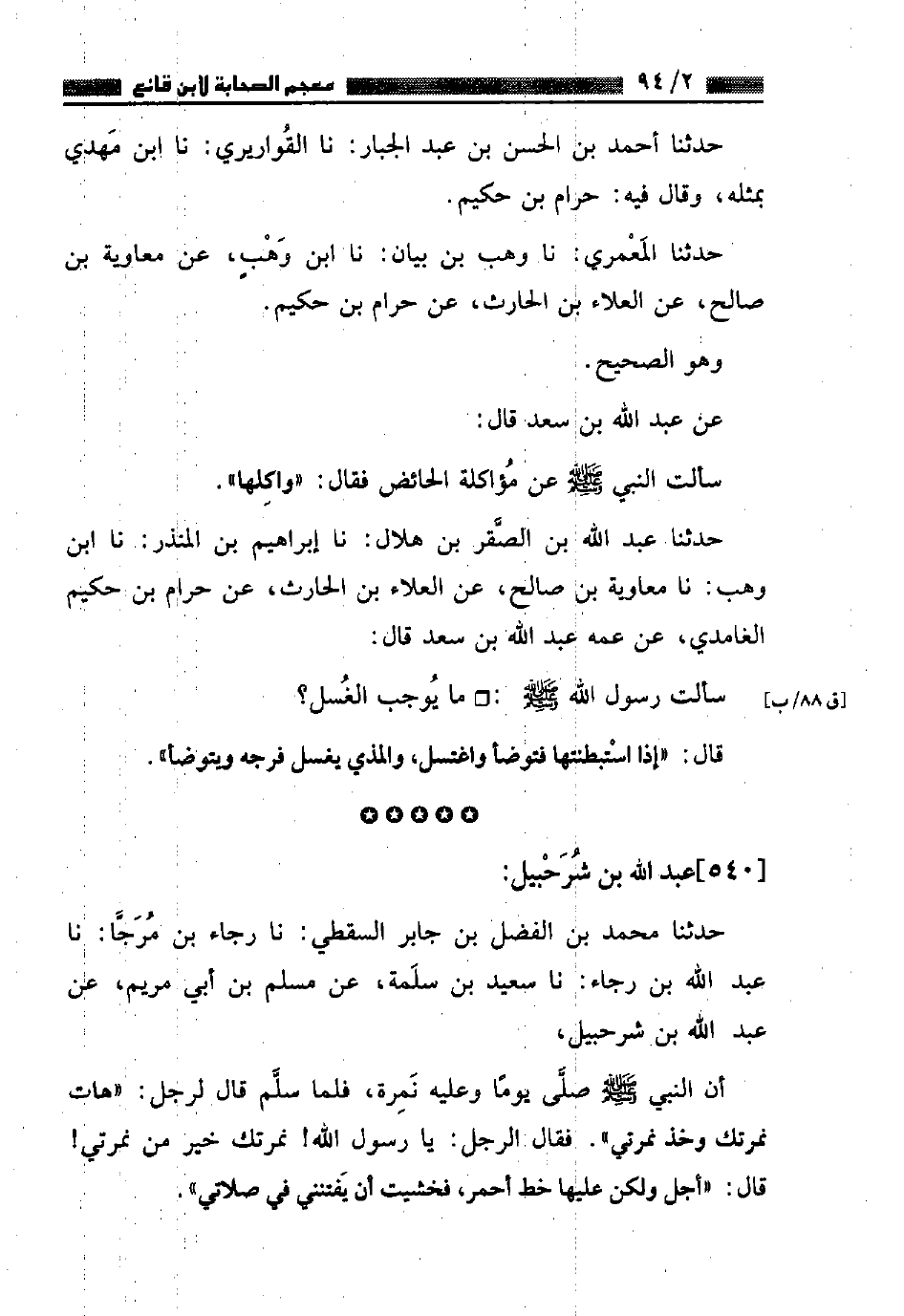 حَدَّثَنَا الْمَعْمَرِيُّ، نا وَهْبُ بْنُ بَيَانٍ، نا ابْنُ وَهْبٍ، عَنْ مُعَاوِيَةَ بْنِ صَالِحٍ، عَنِ الْعَلَاءِ بْنِ الْحَارِثِ، عَنْ حَرَامِ بْنِ حَكِيمٍ وَهُوَ الصَّحِيحُ , عَنْ عَبْدِ اللَّهِ بْنِ سَعْدٍ قَالَ: سَأَلْتُ النَّبِيَّ صَلَّى اللهُ عَلَيْهِ وَسَلَّمَ عَنْ مُؤَاكَلَةِ الْحَائِضِ، فَقَالَ: «وَاكِلْهَا»