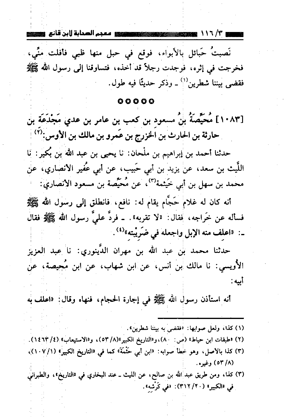 ١٠٨٣ - مُحَيِّصَةُ بْنُ مَسْعُودِ بْنِ كَعْبِ بْنِ عَامِرِ بْنِ عَدِيٍّ مَجْدَعَةُ بْنُ حَارِثَةَ بْنِ الْحَارِثِ بْنِ الْخَزْرَجِ بْنِ عَمْرِو بْنِ مَالِكَ بْنِ الْأَوْسِ