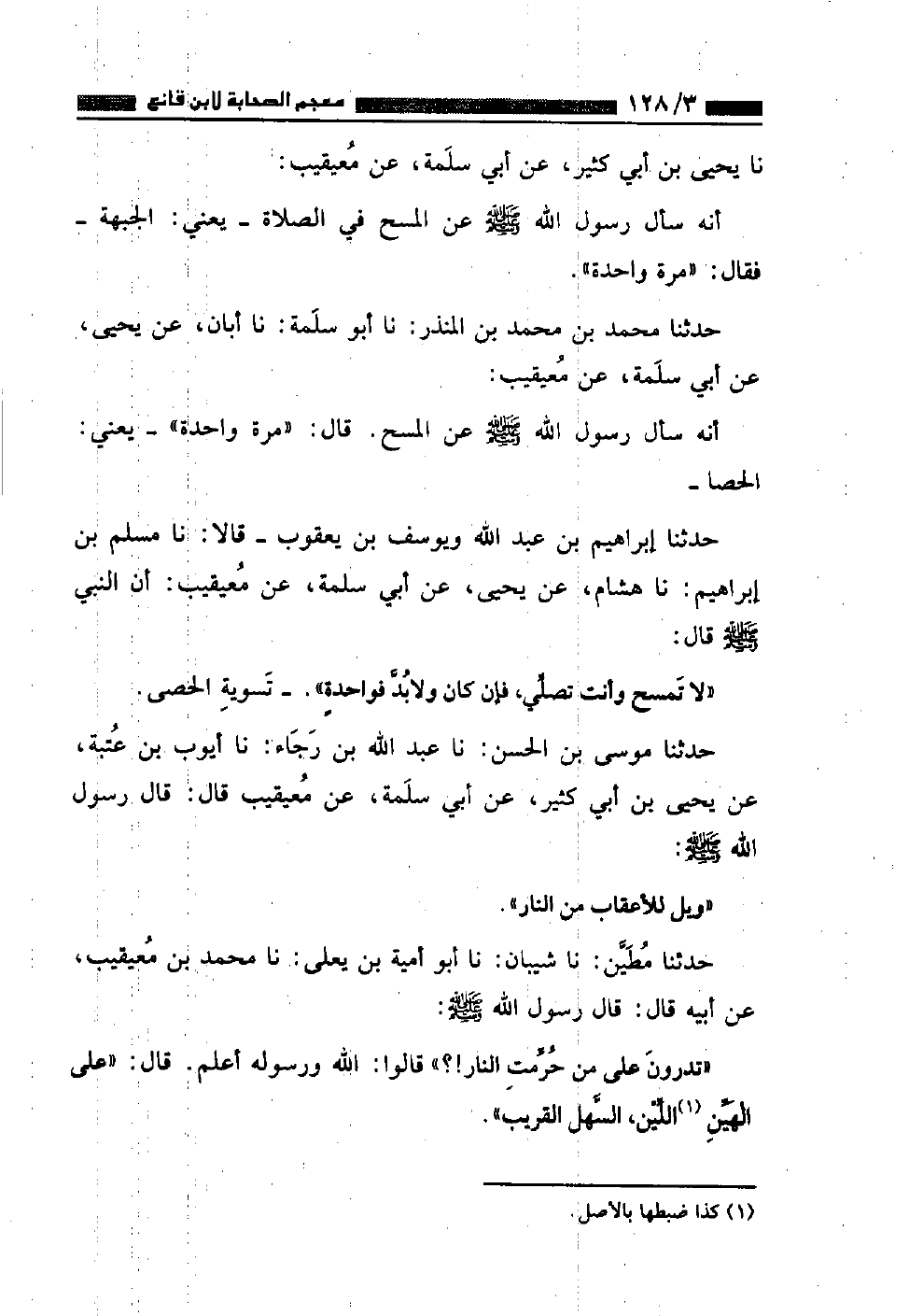 حَدَّثَنَا إِبْرَاهِيمُ بْنُ عَبْدِ اللَّهِ، وَيُوسُفُ بْنُ يَعْقُوبَ قَالَا: نا مُسْلِمُ بْنُ إِبْرَاهِيمَ، نا هِشَامٌ، عَنْ يَحْيَى، عَنْ أَبِي سَلَمَةَ، عَنْ مُعَيْقِيبٍ، أَنَّ النَّبِيَّ صَلَّى اللهُ عَلَيْهِ وَسَلَّمَ قَالَ: «لَا تَمْسَحْ وَأَنْتَ تُصَلِّي فَإِنْ كَانَ وَلَابُدَّ , فَوَاحِدَةٌ تَسْوِيَةُ الْحَصَى»