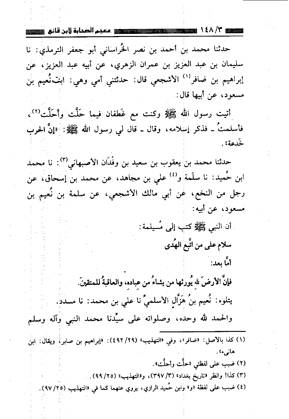 حَدَّثَنَا مُحَمَّدُ بْنُ يَعْقُوبَ بْنِ سَعِيدِ بْنِ وَفْدَانَ الْأَصْبَهَانِيُّ , نا مُحَمَّدُ بْنُ حُمَيْدٍ , نا سَلَمَةُ وَعَلِيُّ بْنُ مُجَاهِدٍ , عَنْ مُحَمَّدِ بْنِ إِسْحَاقَ رَجُلٌ مِنَ النَّخَعِ، عَنْ أَبِي مَالِكٍ الْأَشْجَعِيِّ عَنْ سَلَمَةَ بْنِ نُعَيْمِ بْنِ مَسْعُودٍ، عَنْ أَبِيهِ أَنَّ النَّبِيَّ صَلَّى اللهُ عَلَيْهِ وَسَلَّمَ كَتَبَ إِلَى مُسَيْلِمَةَ: " سَلَّامٌ عَلَى مَنِ اتَّبَعَ الْهُدَى أَمَا بَعْدُ: فَإِنَّ الْأَرْضَ لِلَّهِ يُوَرِّثْهَا مَنْ يَشَاءُ مِنْ عِبَادِهِ وَالْعَاقِبَةُ لِلْمُتَّقِينَ "